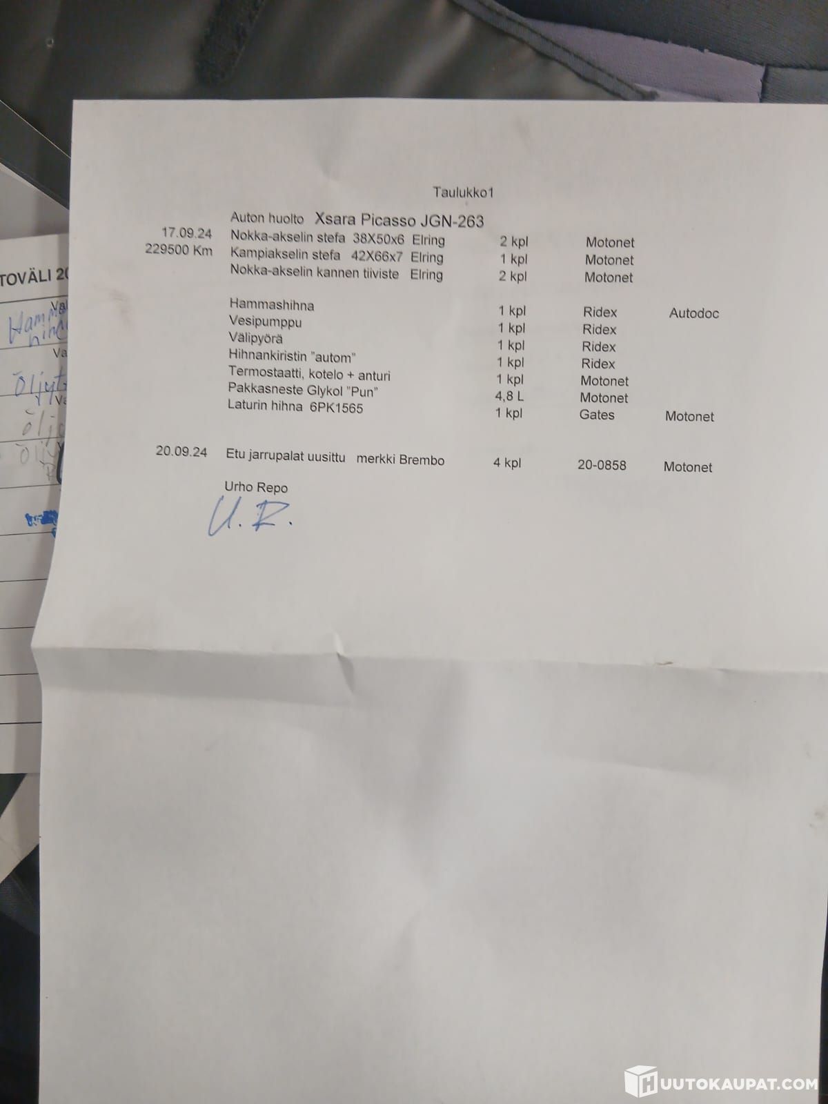 Viimeisin jakohihnan vaihto tehty 229500 kilometriä ajettuna 9 / 2024