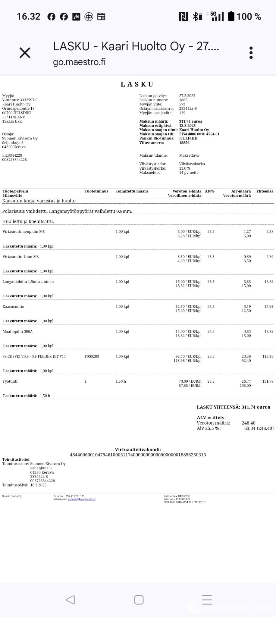 Viimeisessä kuvassa viimeisin huolto lasku, näkee mitä viimeksi huollettu