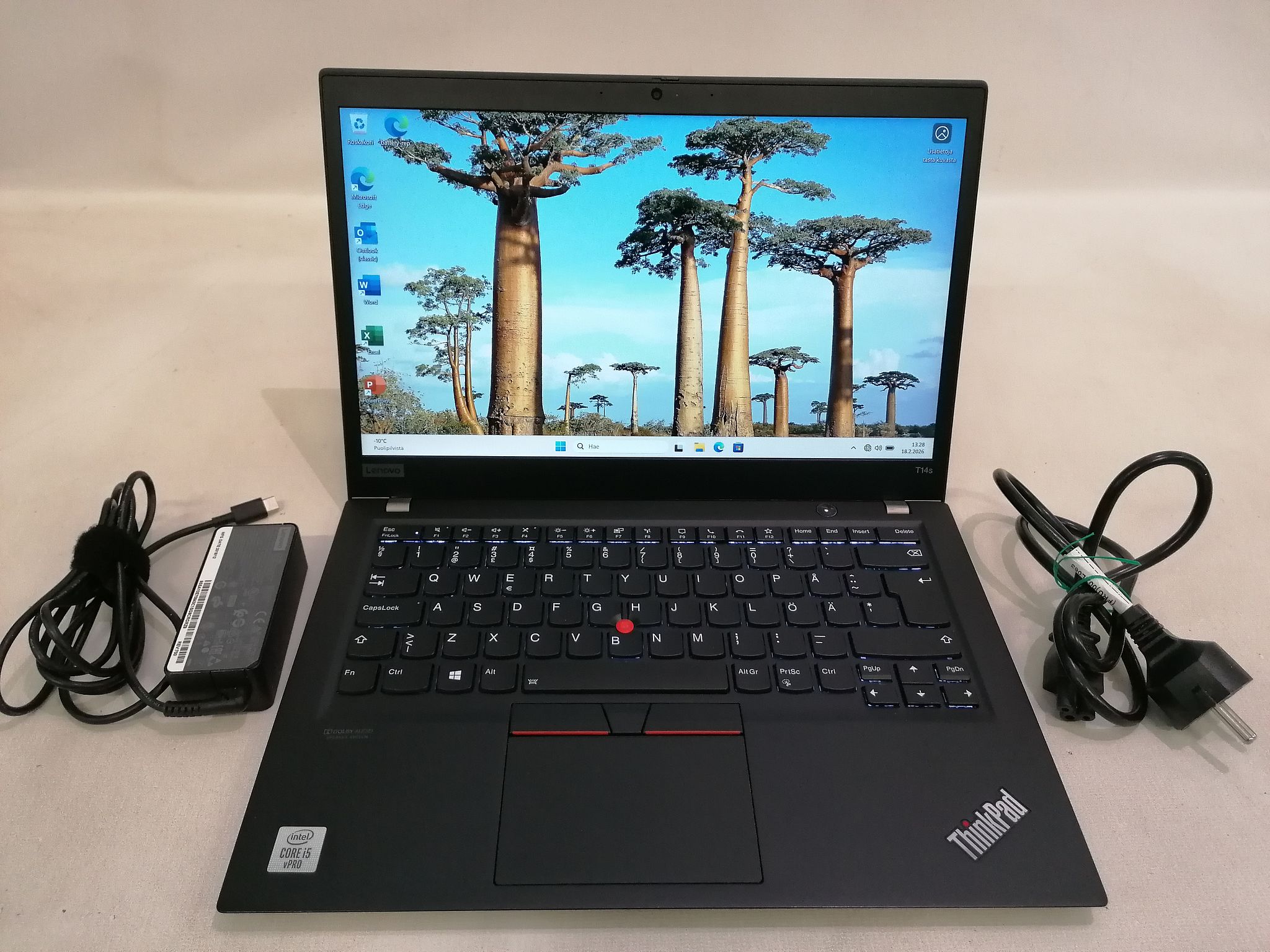Varusteluun kuuluvat sormenjälkilukija, HD-webkamera yksityisyyssulkijalla sekä kaksoismikrofoni, jotka lisäävät turvallisuutta ja käyttömukavuutta etäpalavereissa. Laturi sisältyy mukaan.
