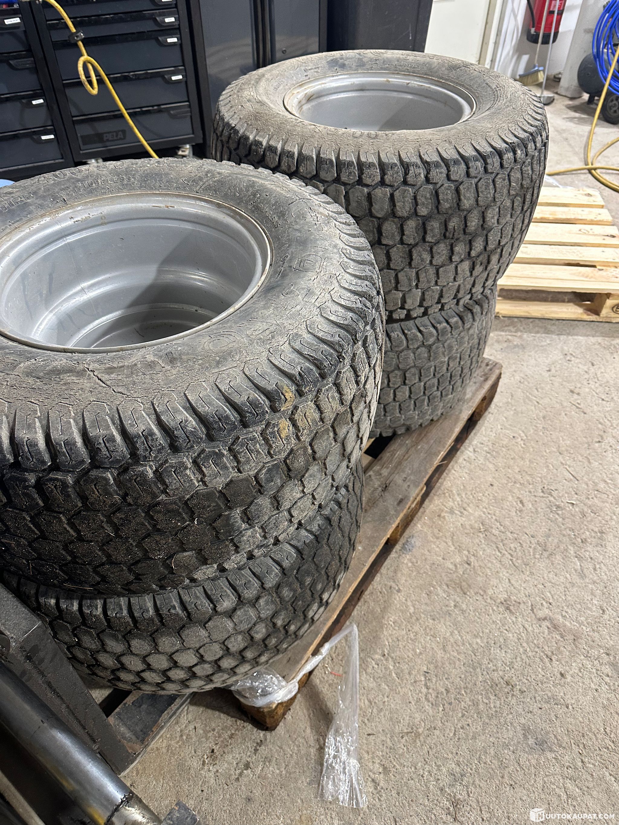 Avantin nurmi renkaat, ollut kiinni Avant 760. Kulumaa ja kolhuja. Yksi rengas ei pidä ilmaa.