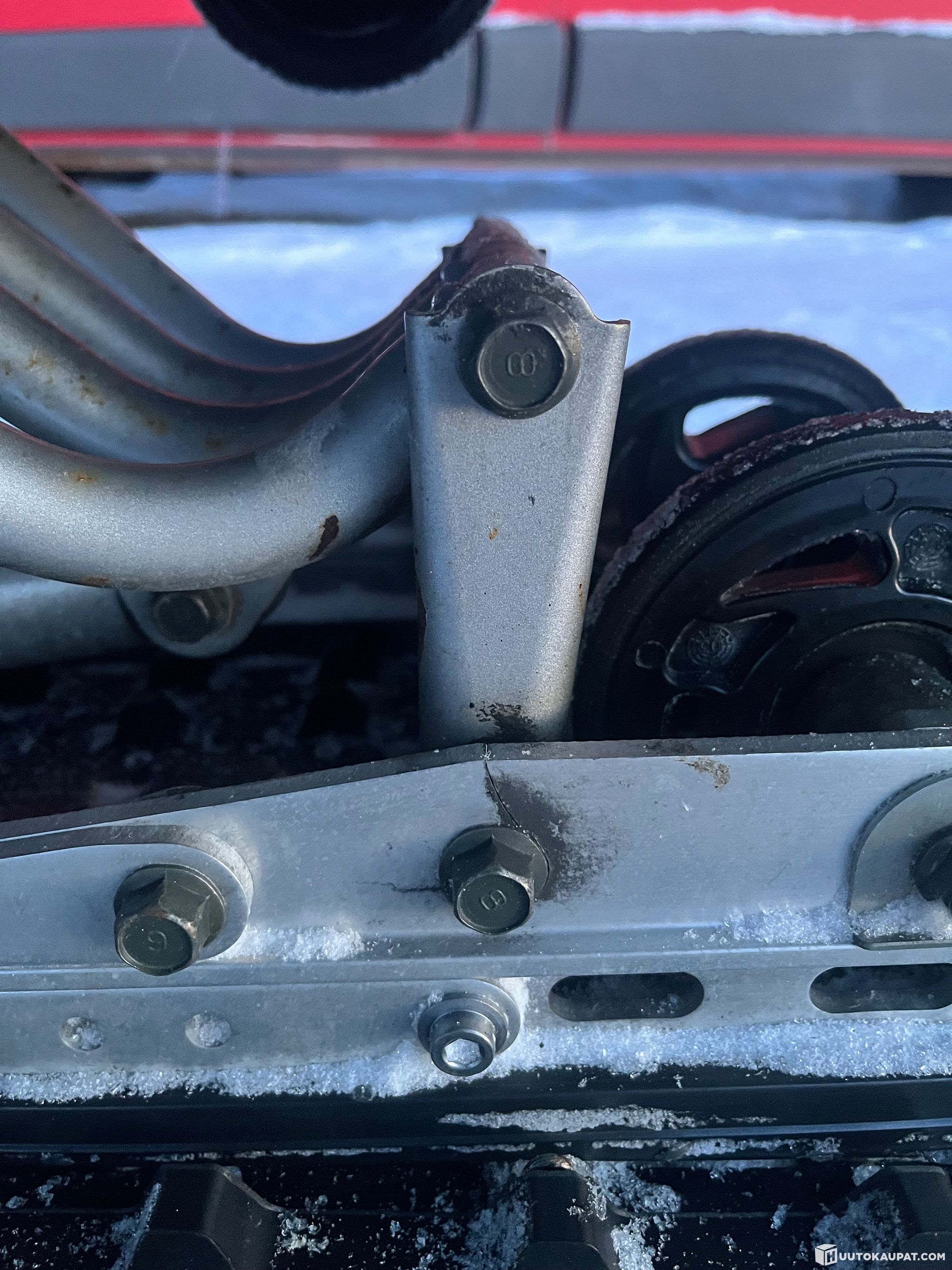 Liukukiskossa pari halkeamaa pultien juuresta. Katso kuva.