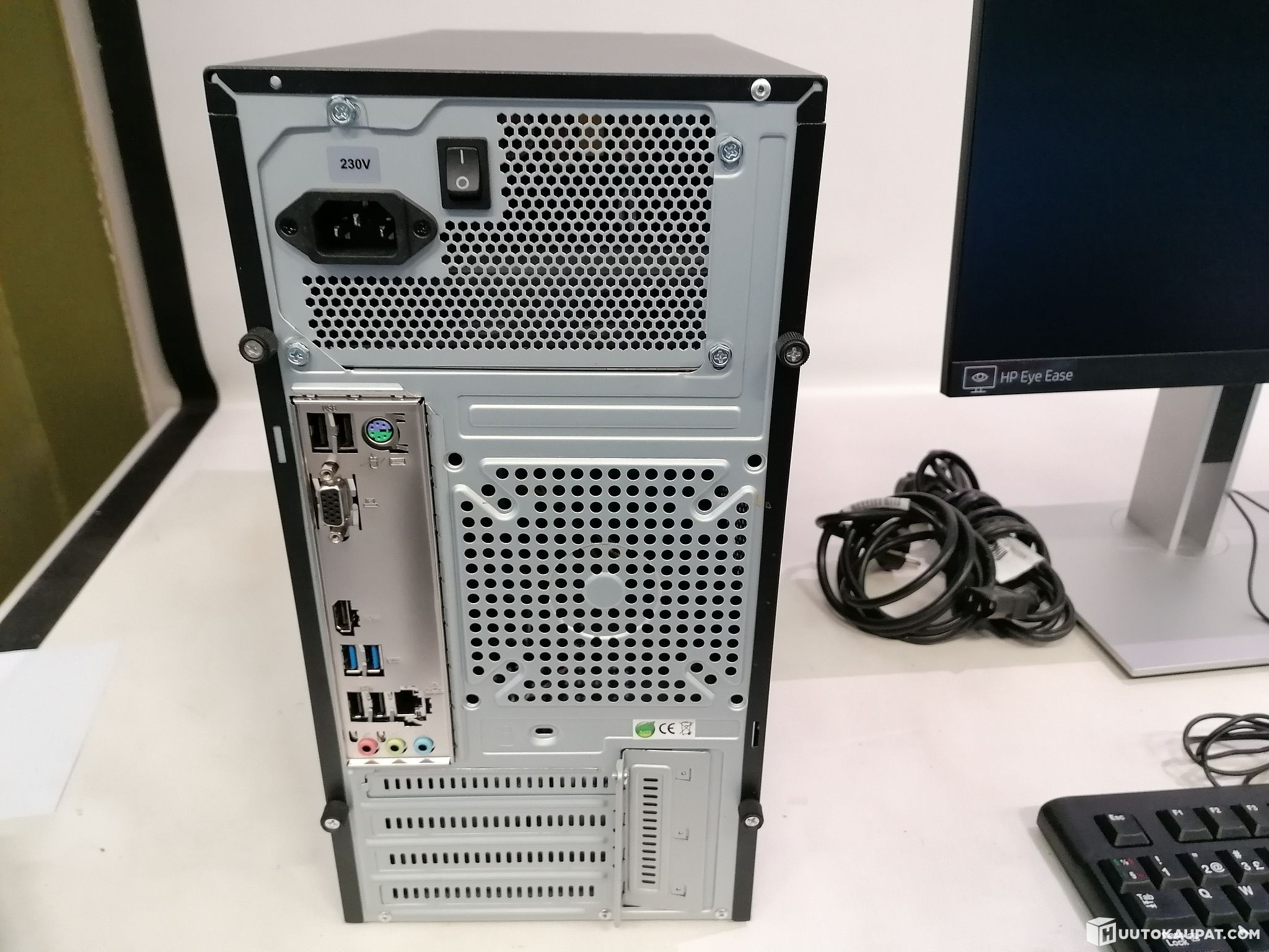 Mukana tulee HP yritysnäyttö Full HD alempana lisää tästä, hiiri, näppäimistö, virtajohto, HDMI ja ethernet kaapeli koneelle.