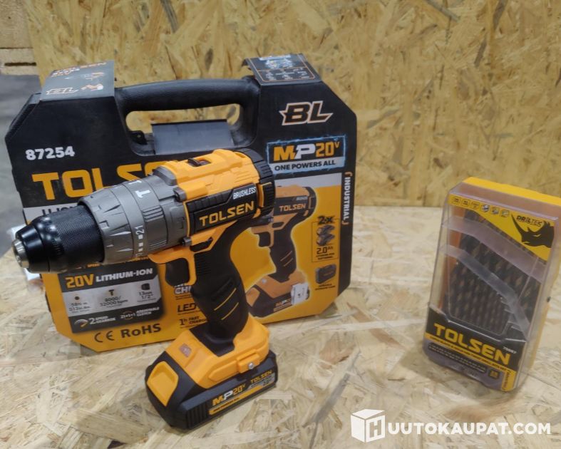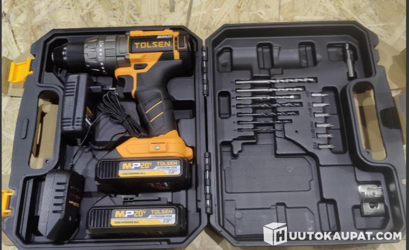 Porakone setti, sisältää koneen, kaksi 2Ah akkua laturin ja teriä