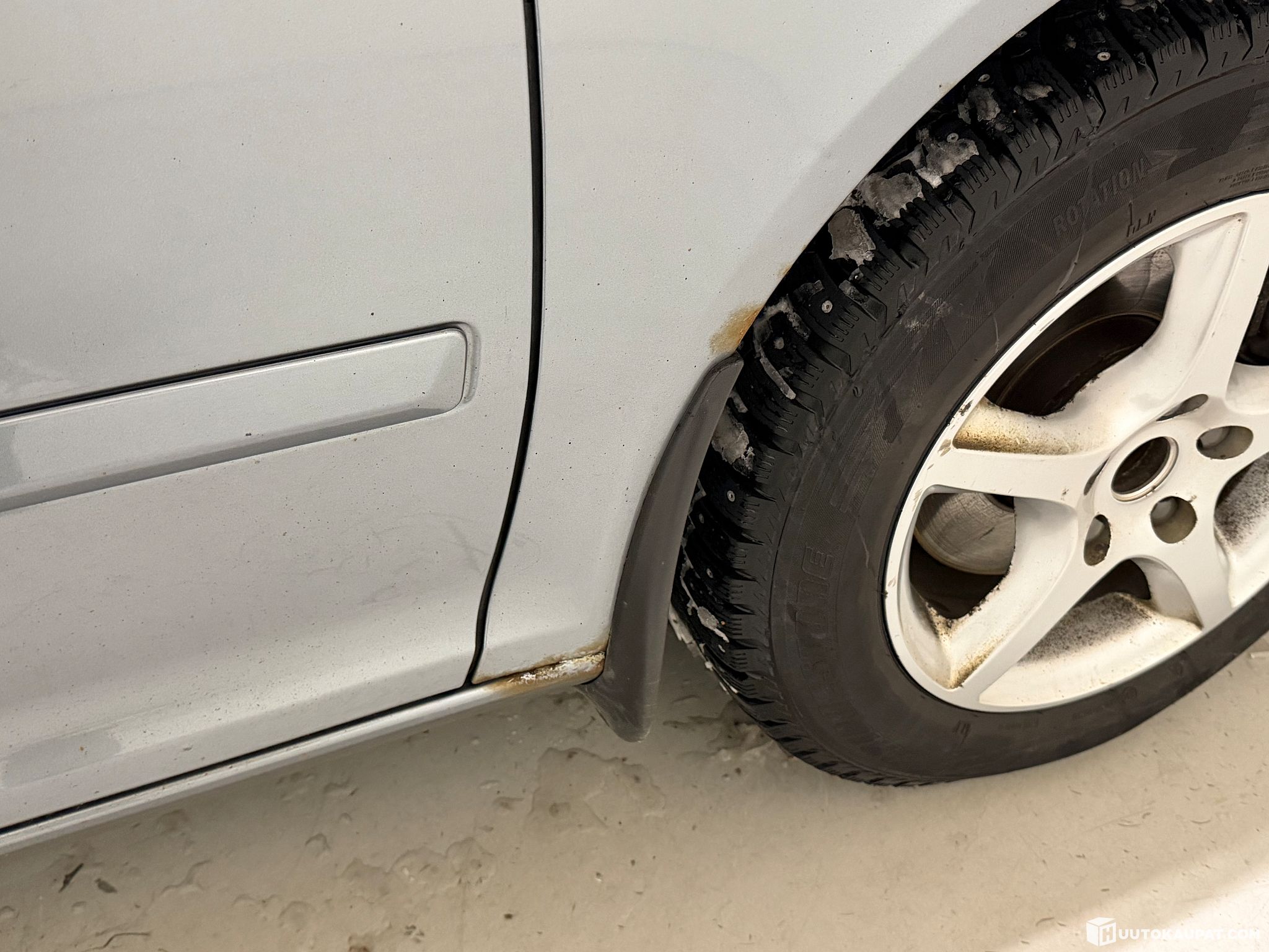 Autosta löytyy kahdet renkaat alumiinivanteilla, talveksi nastat.