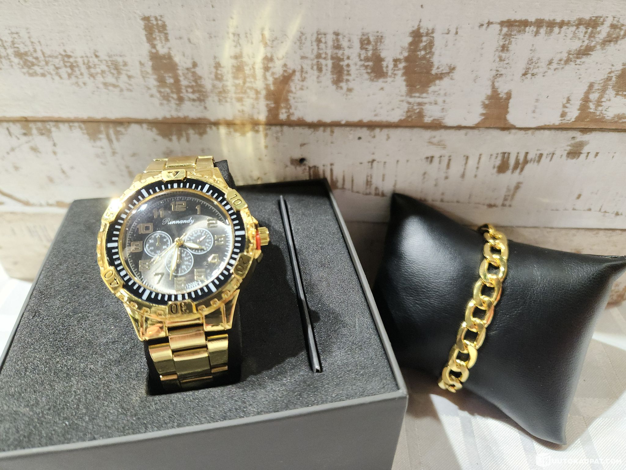 Näyttävä kullan värinen rannekello sekä rannekoru.