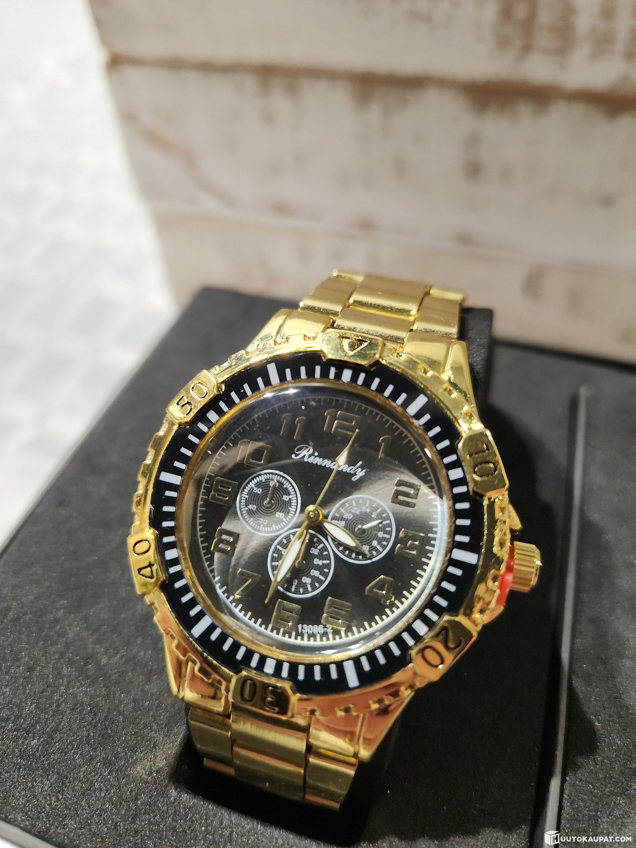 Kellotaulu musta/kullanväriset numerot.