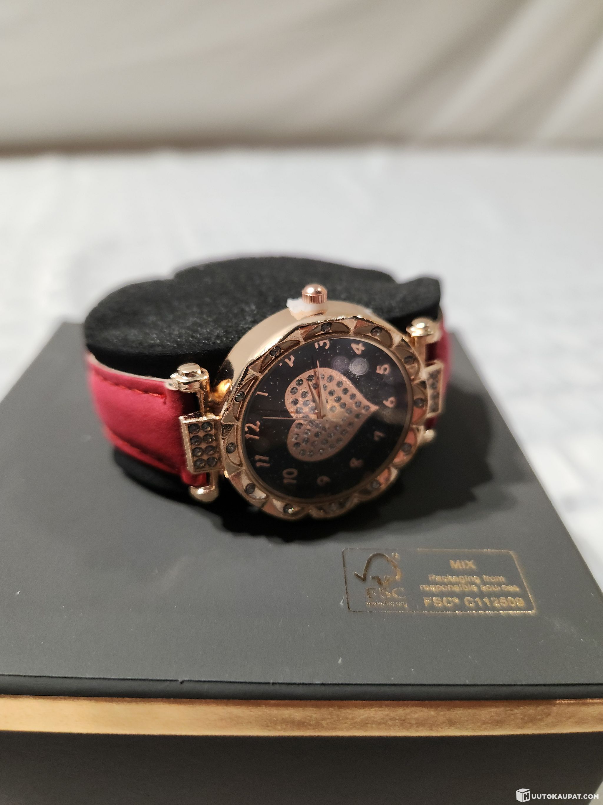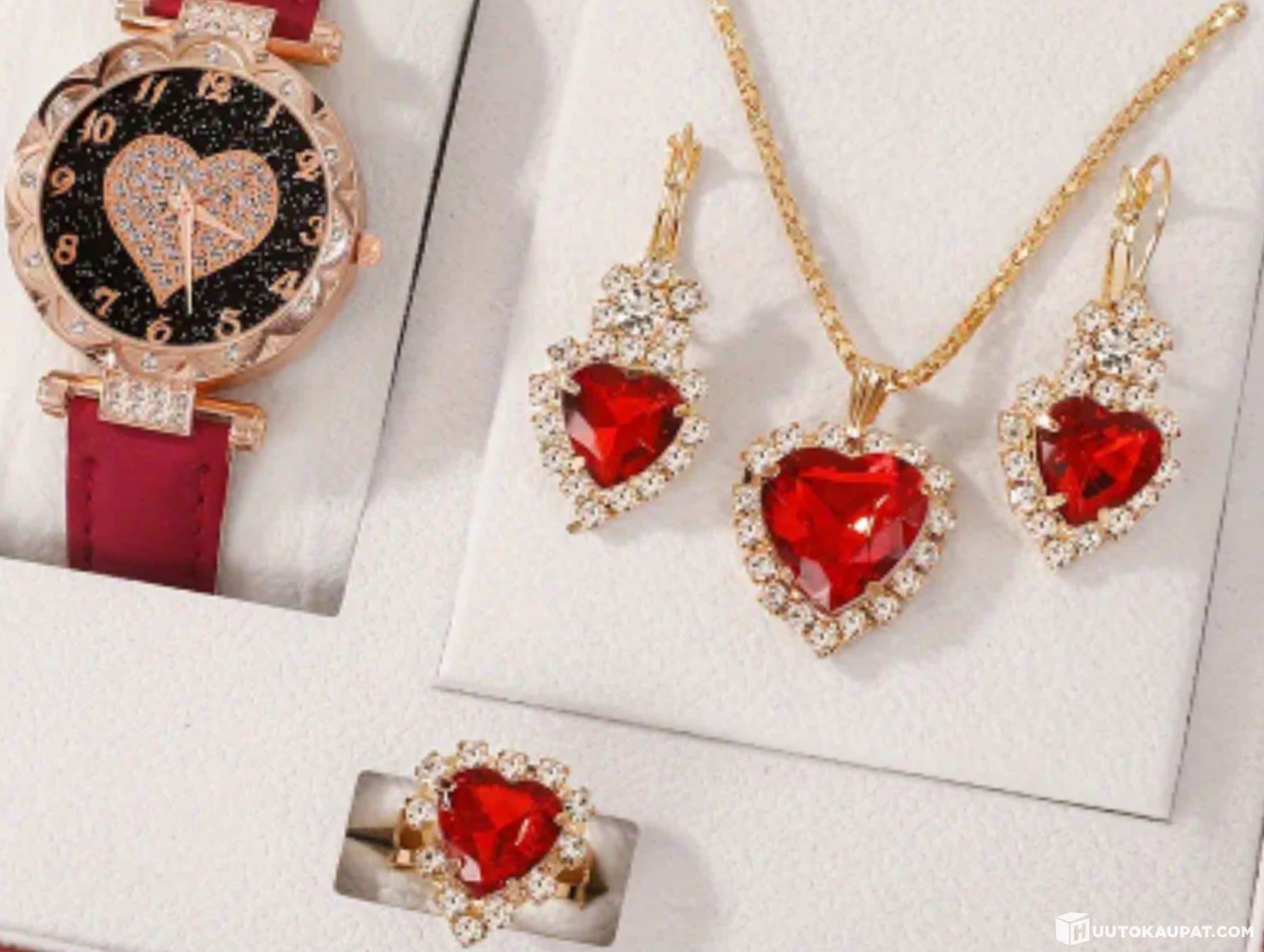 Paketissa itse kello sekä 4kpl kullan/punaisen värisiä koruja.