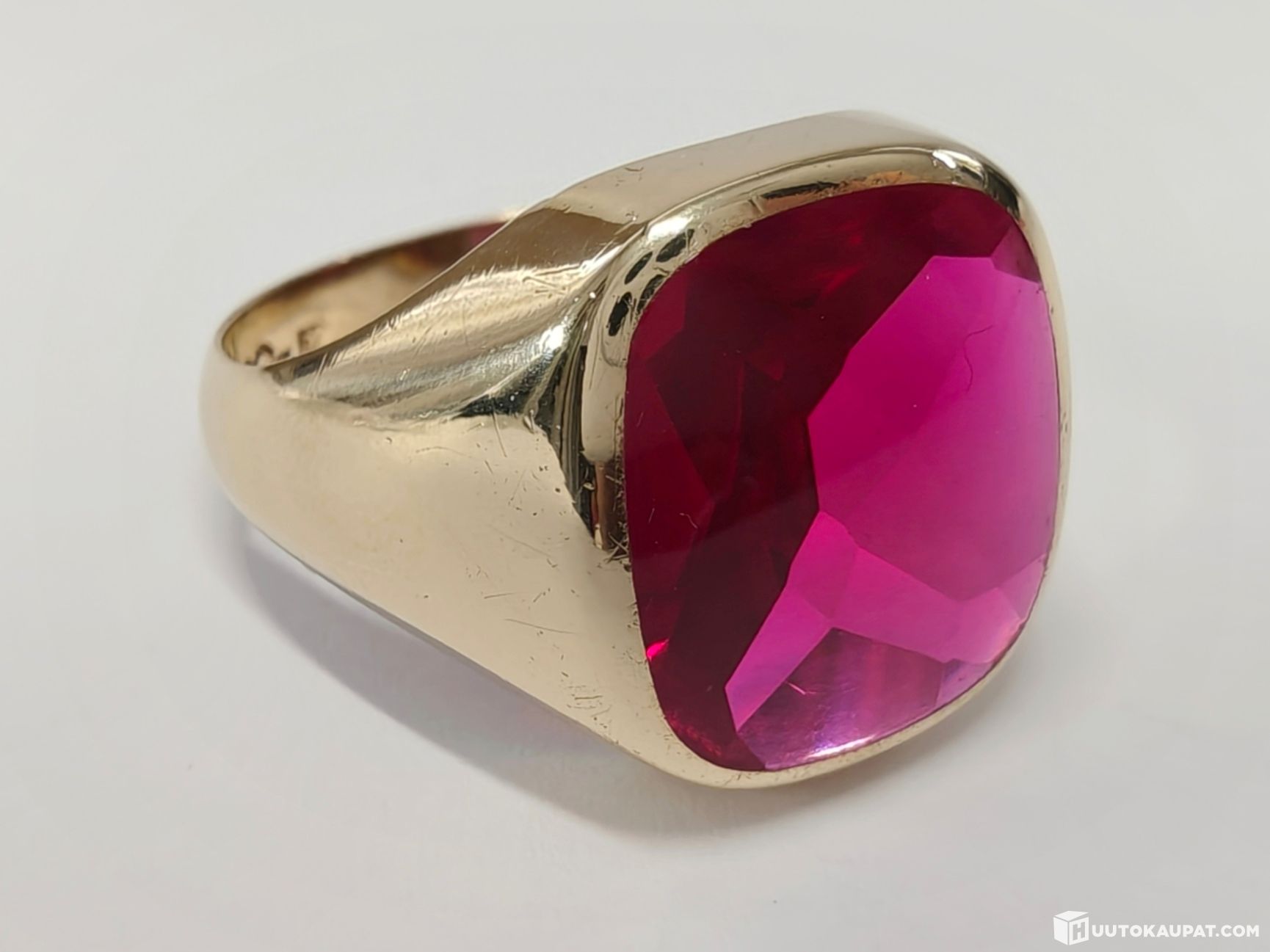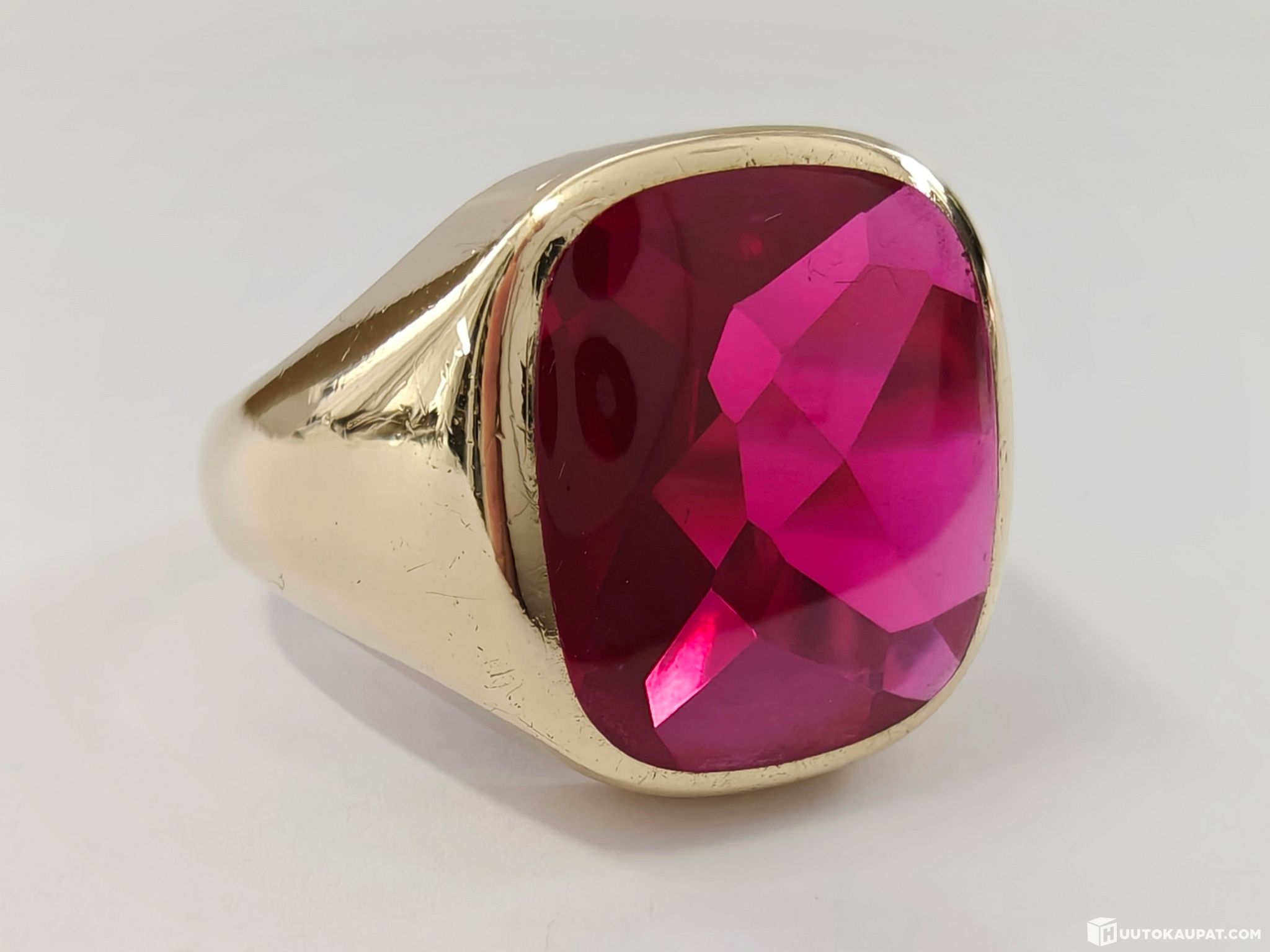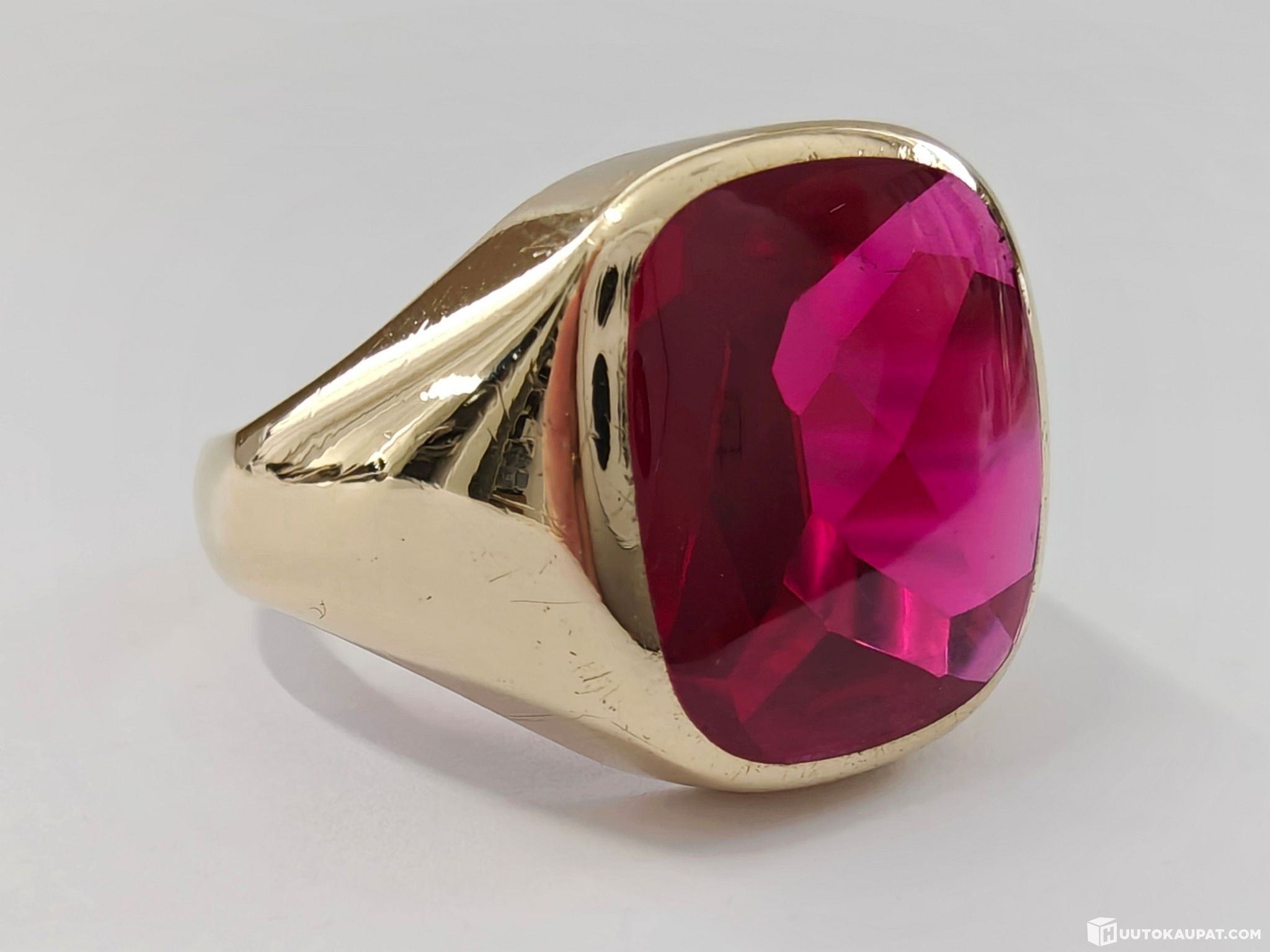 Todella komea kantasormus 585 14k kultaa. Huom! Kiven sävy on luonnossa enemmän klassinen rubiininpunainen.