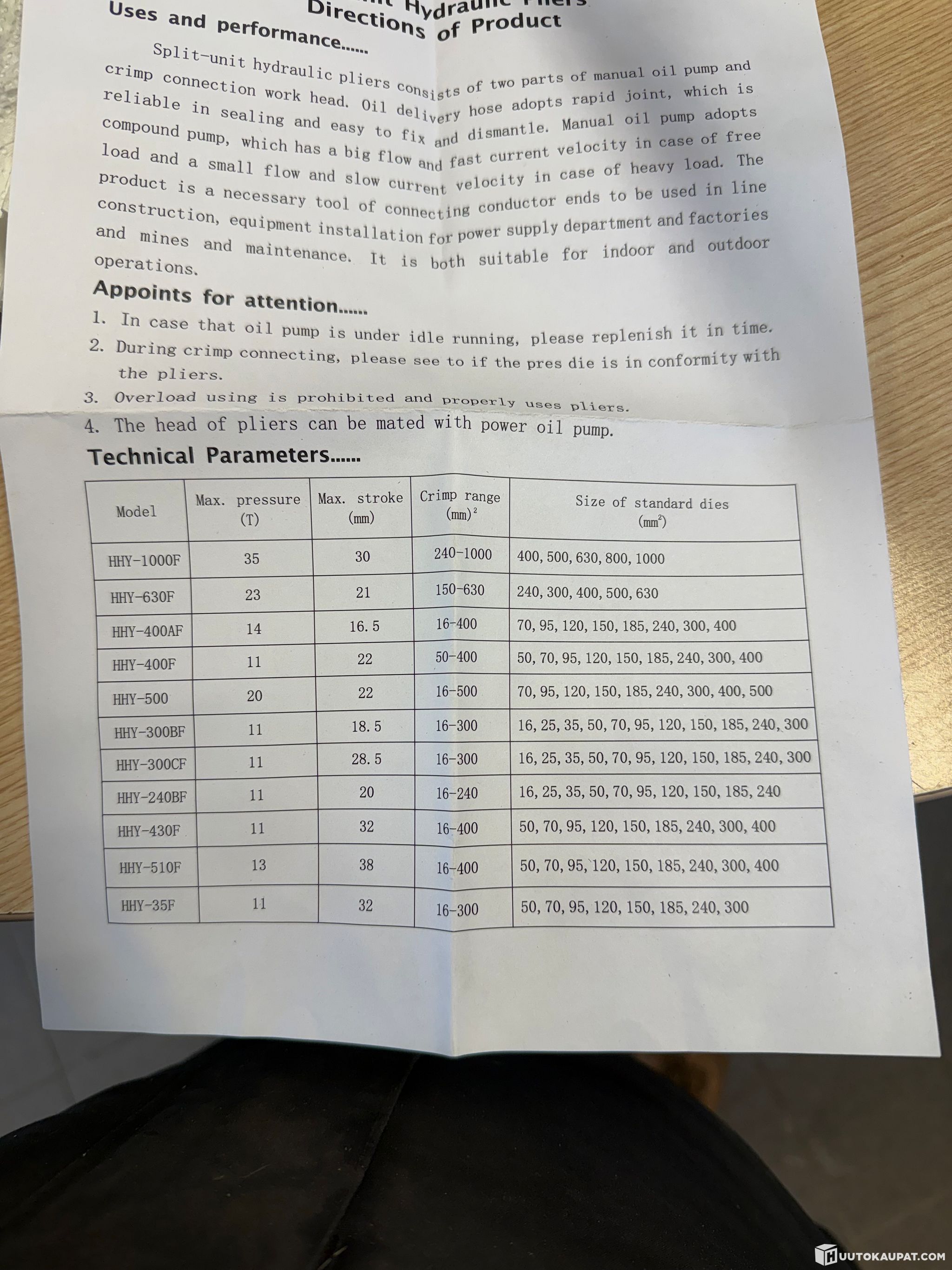 Soveltuu pienten letkuliitimien puristamiseen/ kaapelikenkienpuristamiseen