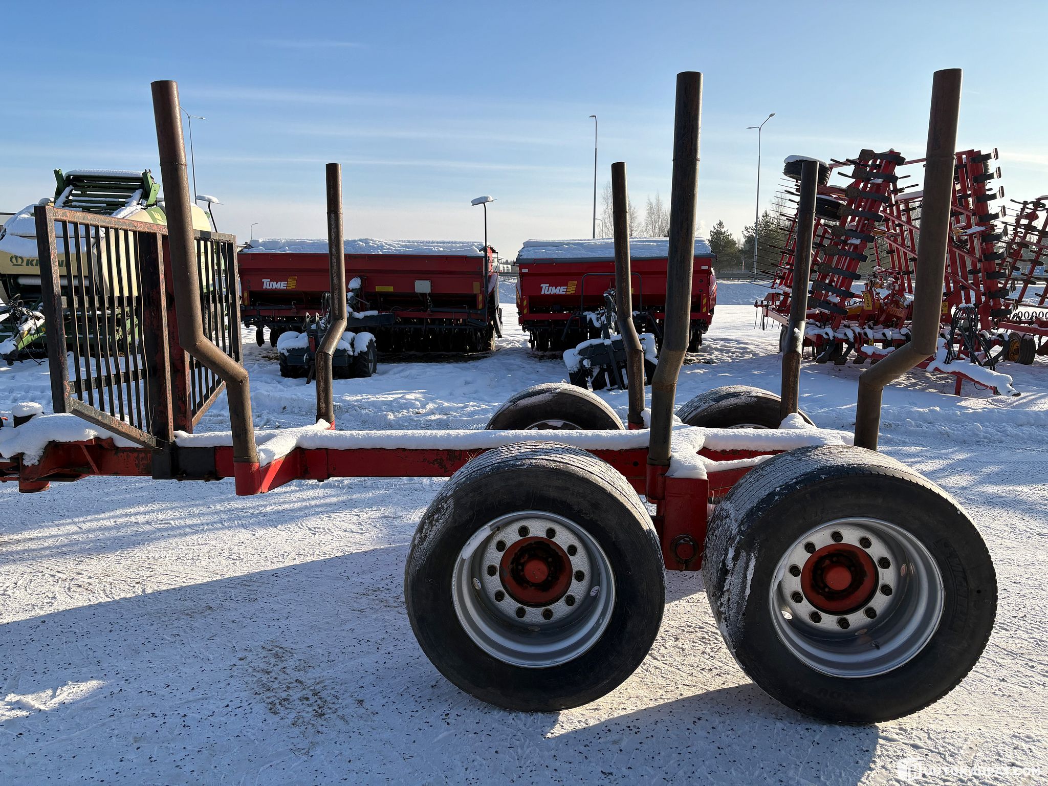 Huutokaupataan järeä Jusmaran metsäkärry. Nokalla sovitteet Farmin kuormaajalle. Lastaustilavuus 15m3.
