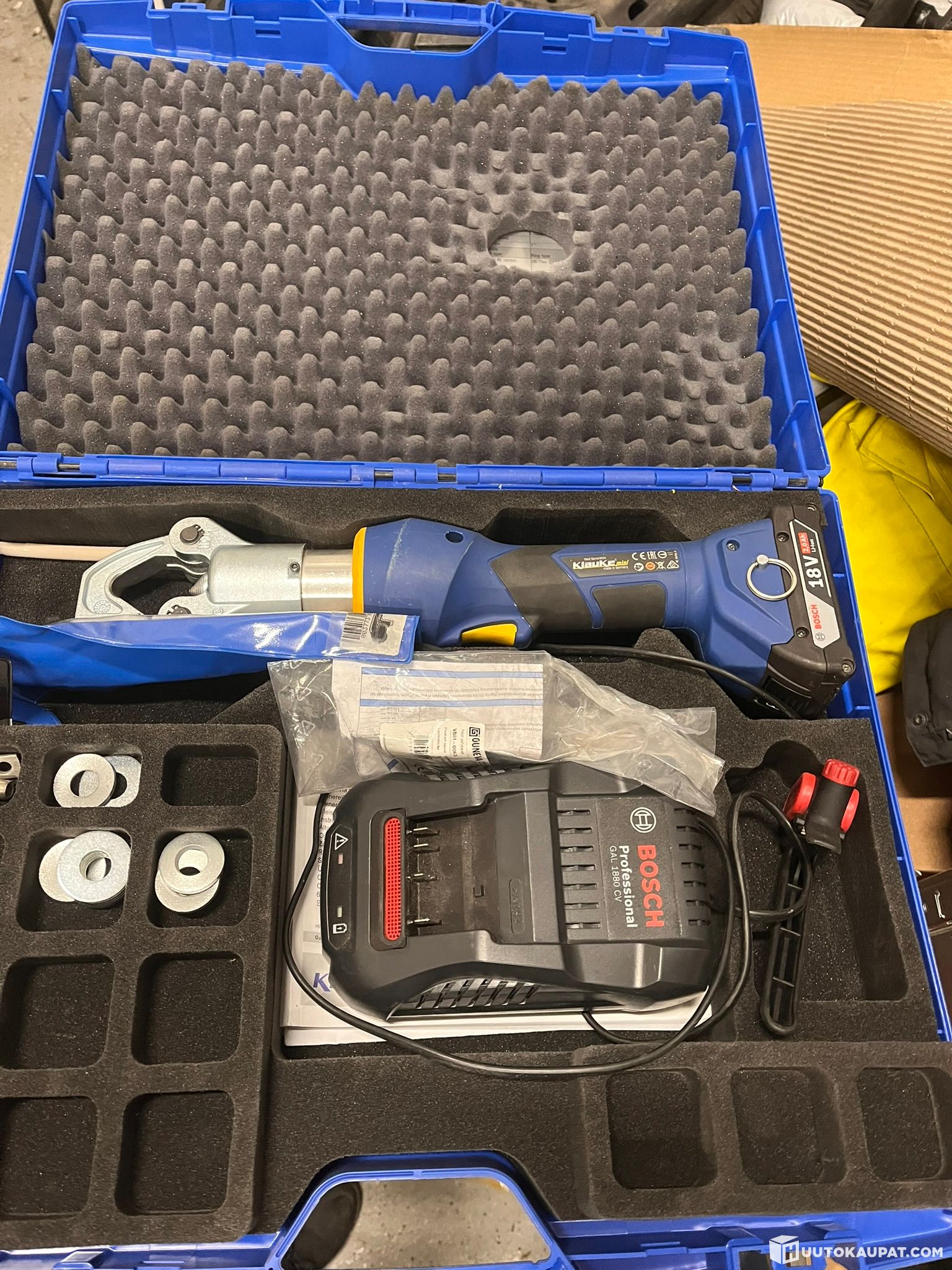 1kpl Klauke puristin + akku ja laturi.