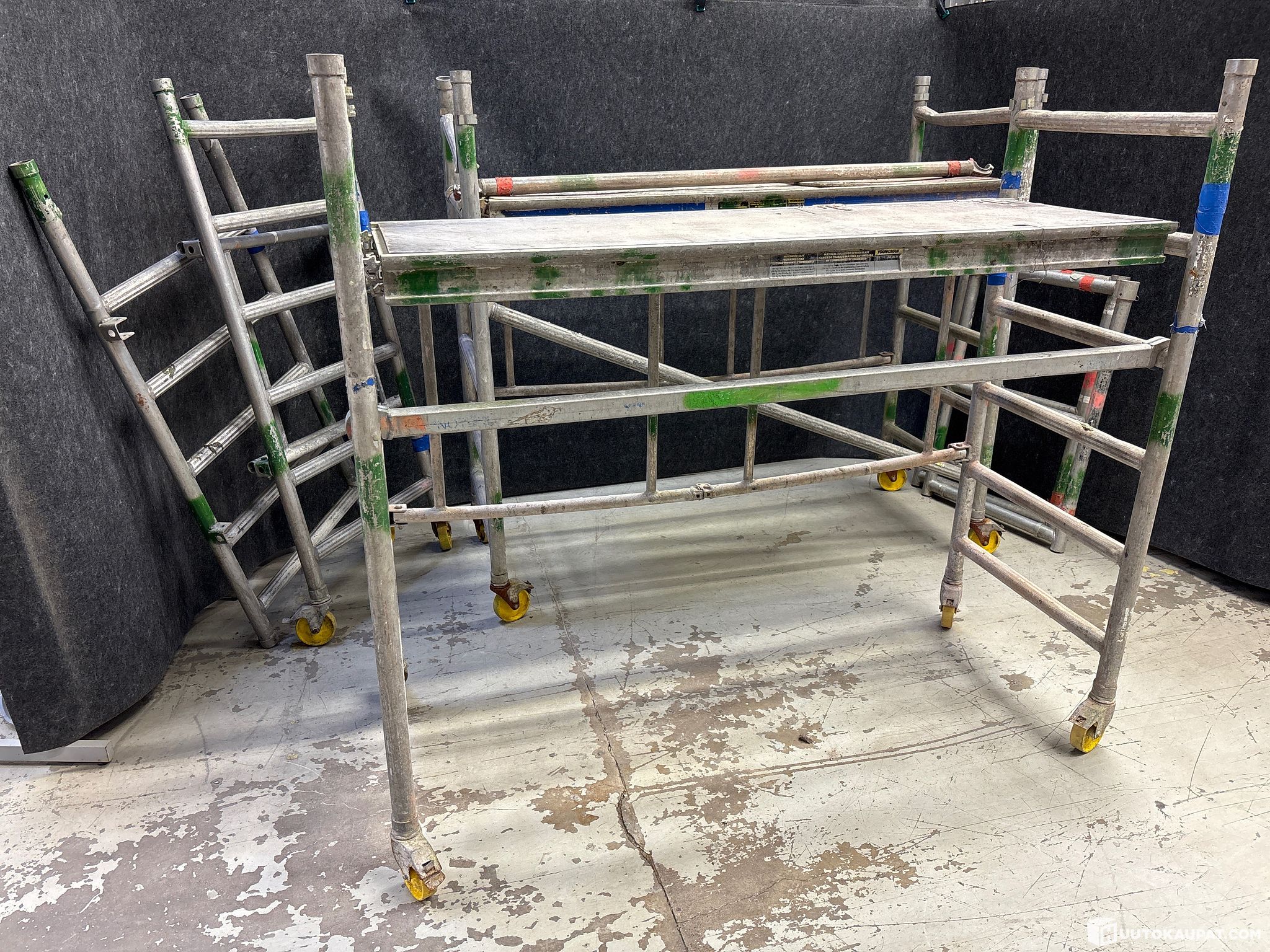 Kaksi rakennustelinettä (koottuna) ja yks runko josta puuttuu rengas ja kiinnikkeitä. Telineet huonokuntoisia. Pyörät eivät pyöri. Osia voi puuttua. Sillan pituus kaikissa sama 170cm ja syvyys 60cm. Telineiden korkeus (maasta korkeimpaan kohtaan) 172cm.