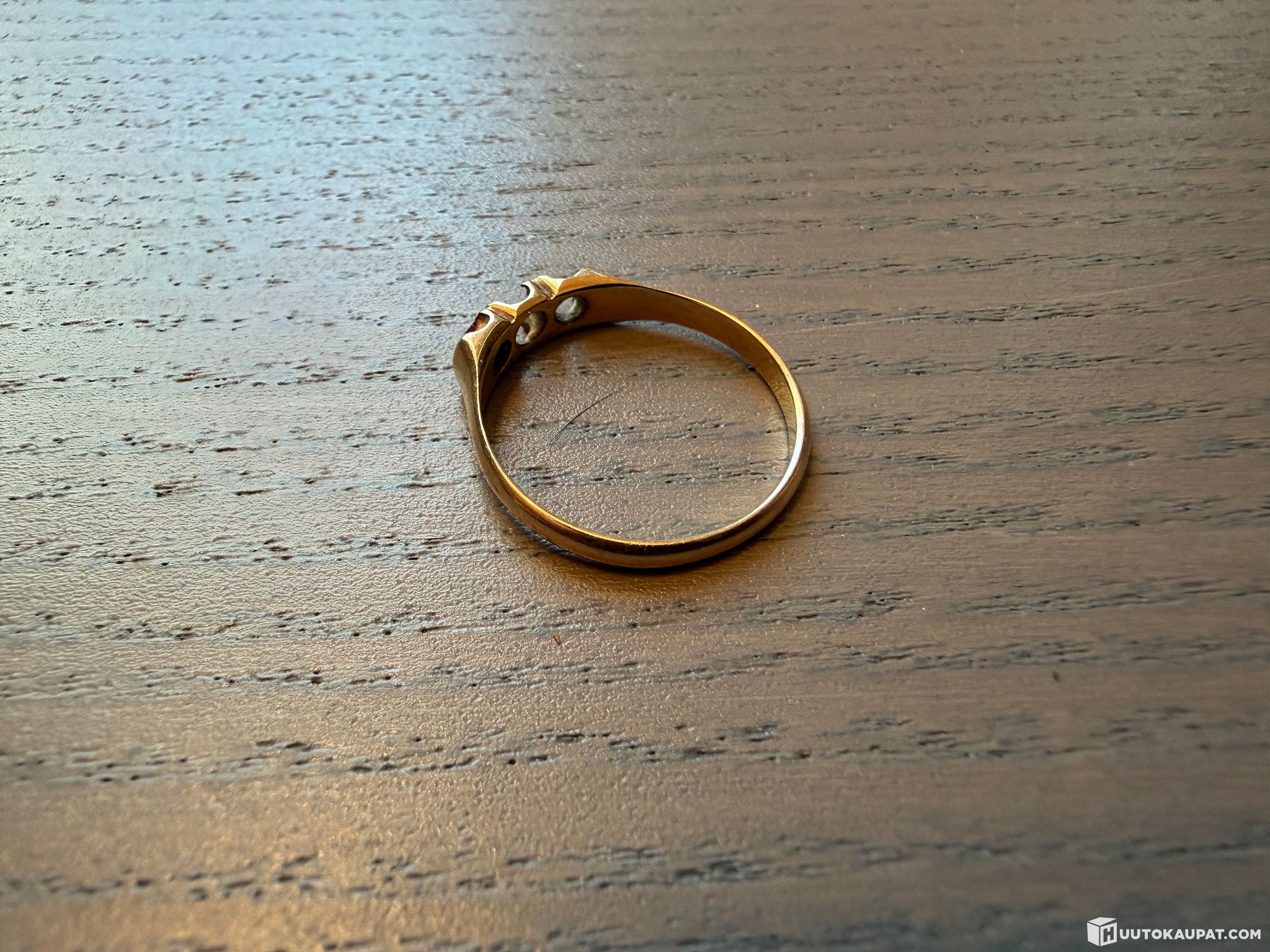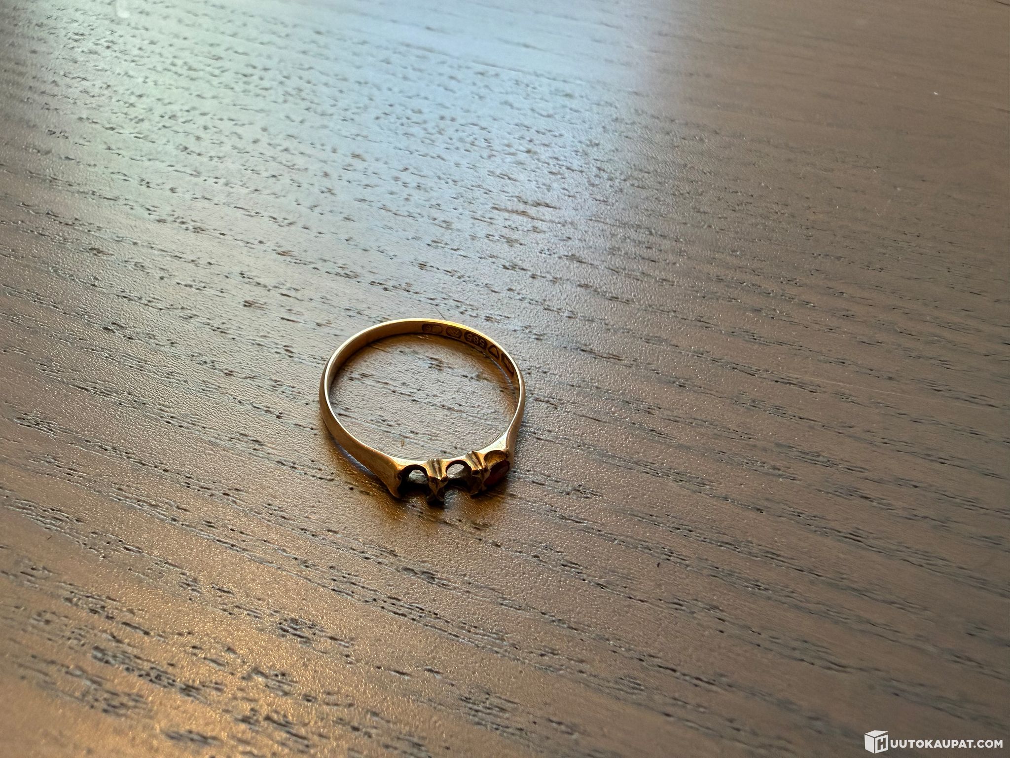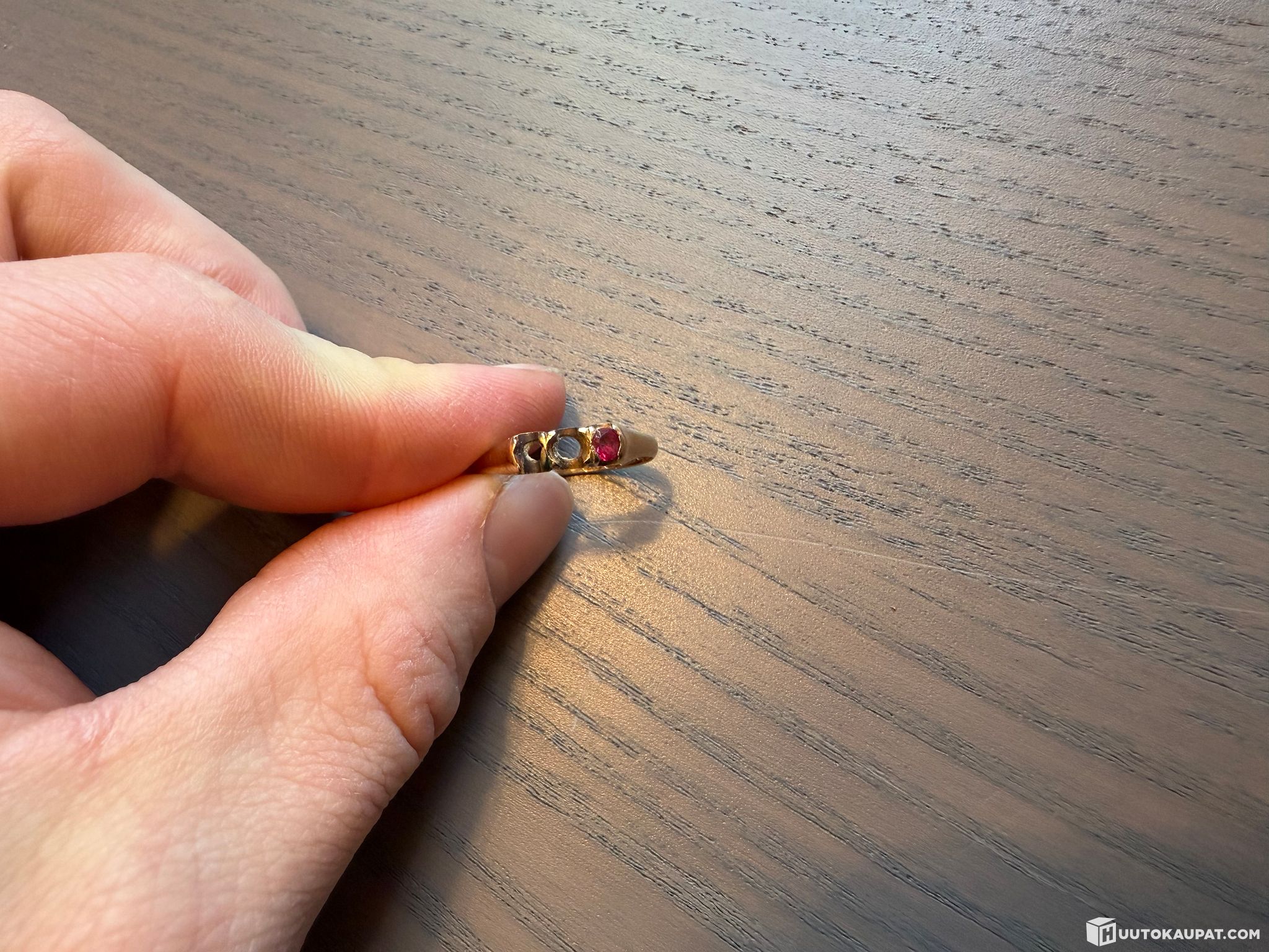 Kuolinpesä myy kuvien kultaisen sormuksen punaisella kivellä.