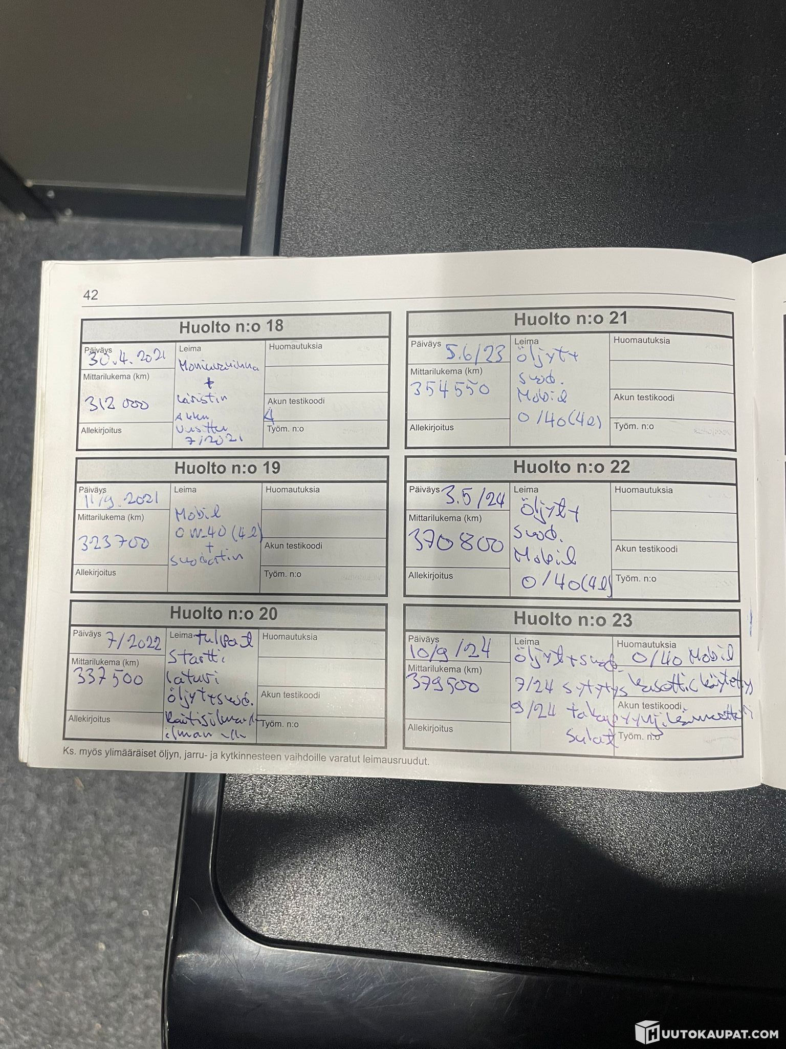 Kyllä, Hyvä huoltohistoria, kirja kuvattu.