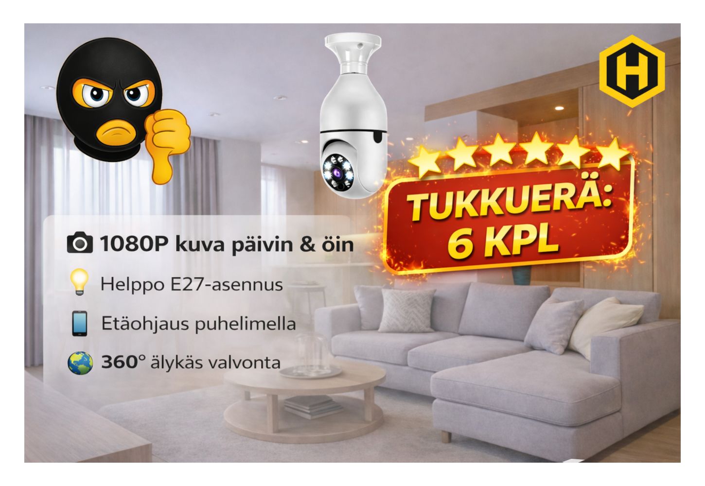 Tämä tehokas Full HD -valvontakamera tuo turvaa kotiin, mökille, toimistoon tai varastoon. Asennus on helppoa – kierrä vain kameravalaisin E27-lampun kantaan. Etävalvonta suoraan puhelimesta, liikkeentunnistus, kaksisuuntainen ääni ja värillinen yönäkö tekevät tästä täydellisen valinnan.