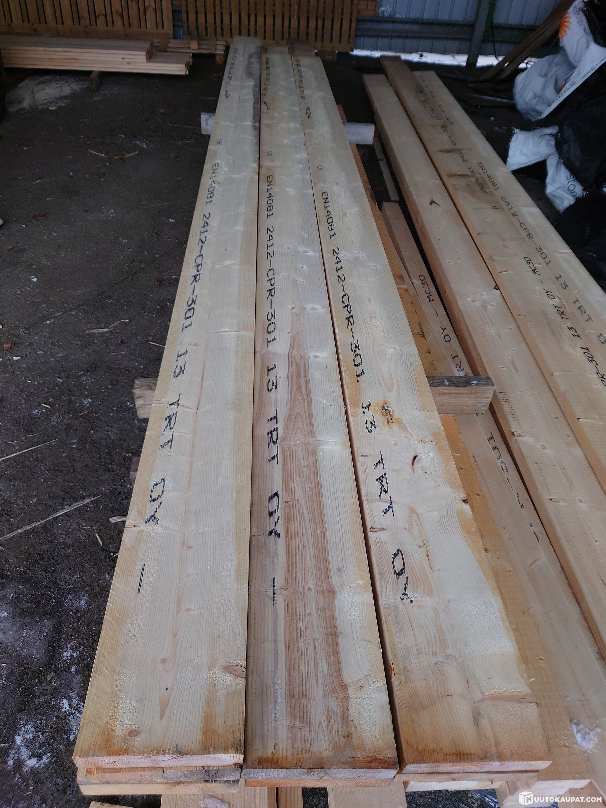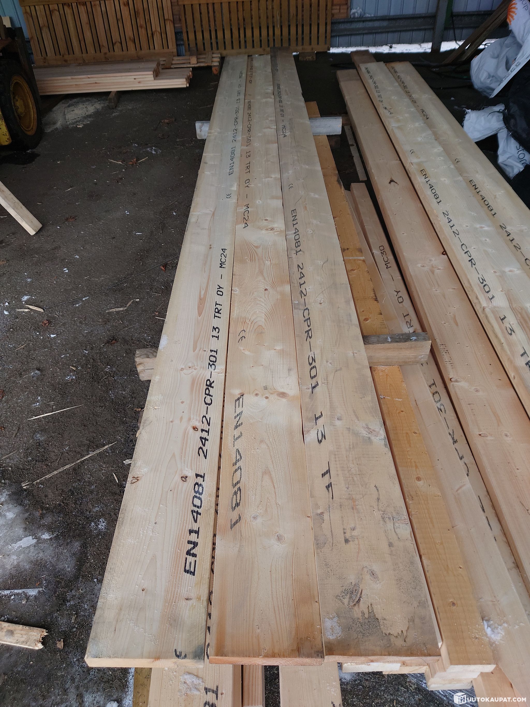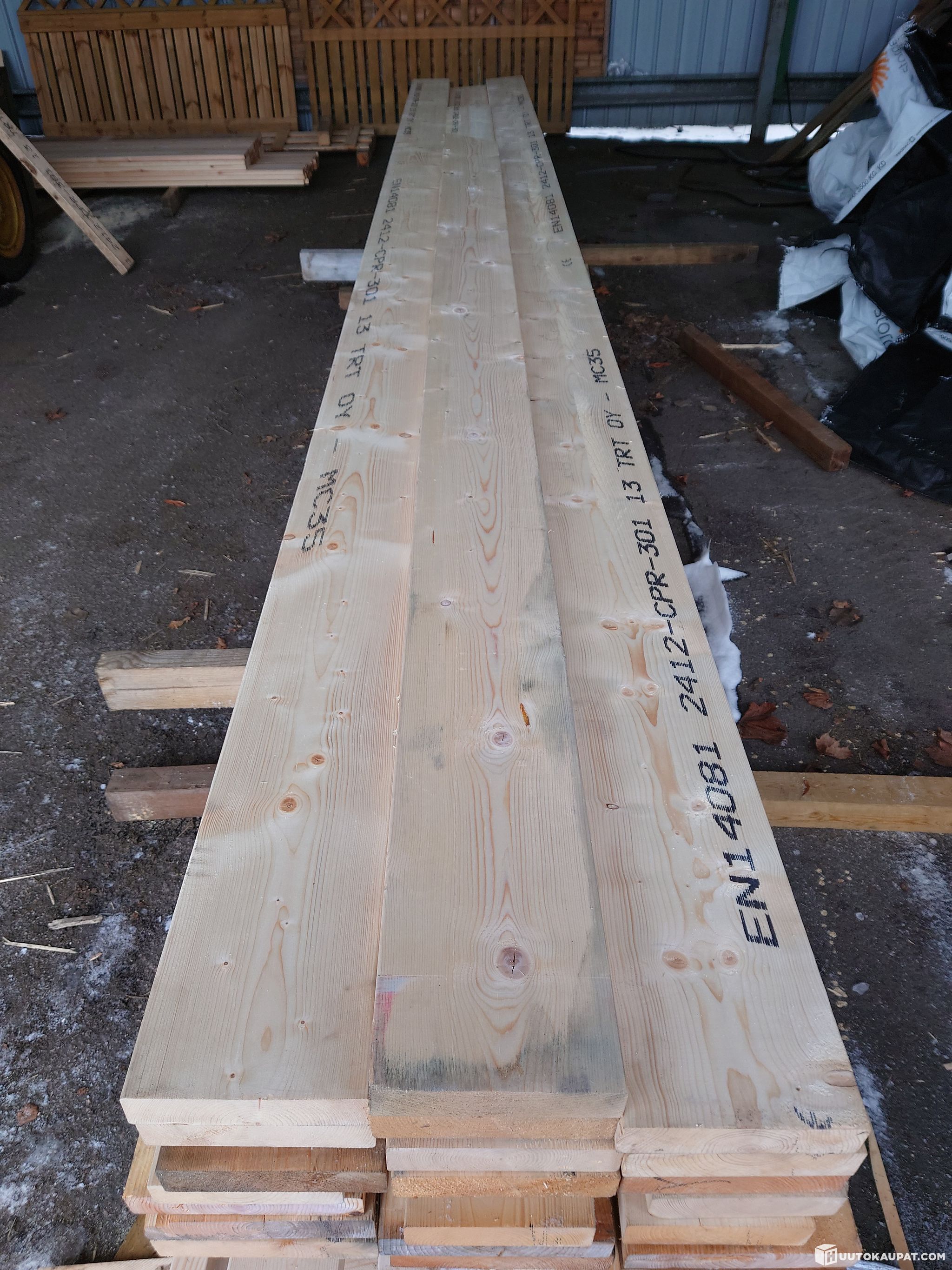 Tarjolla nippu kolmea eri dimension lujuuslajiteltua ja mitallistettua kuusilankkua.