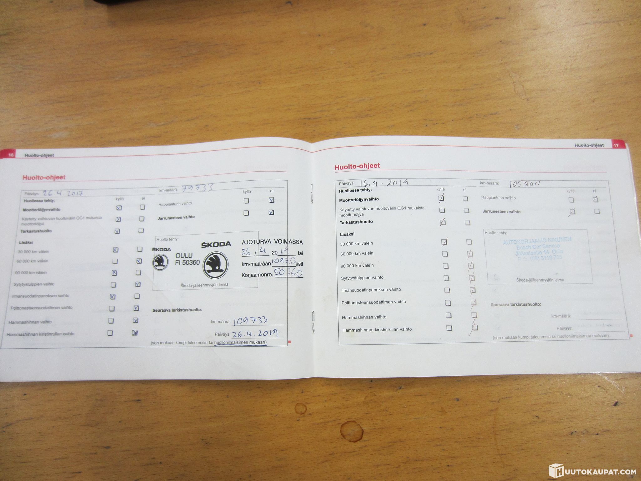 Huoltokirja on likimain täydellinen ja viimeisen huollon jälkeen ajettua vain n.2tkm