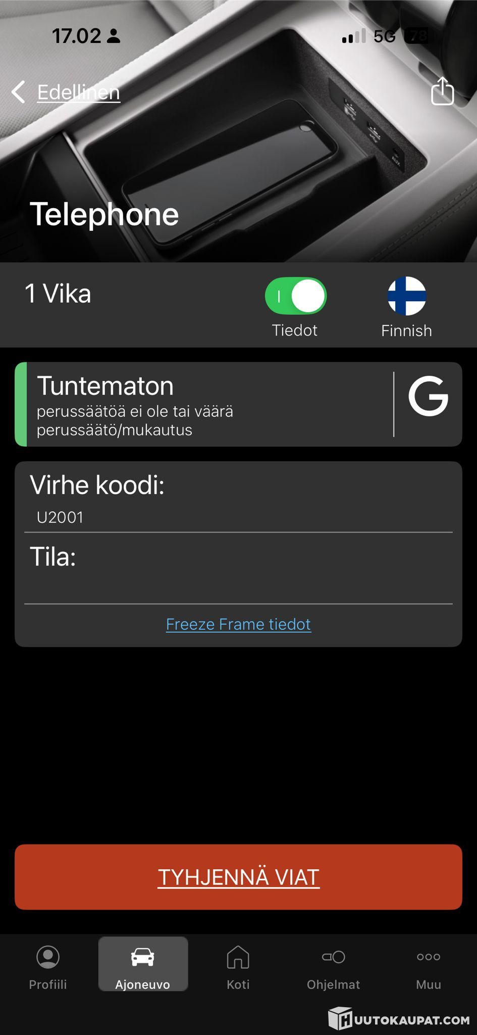 Puhelin: Vikakoodi (autossa ei puhelinta).