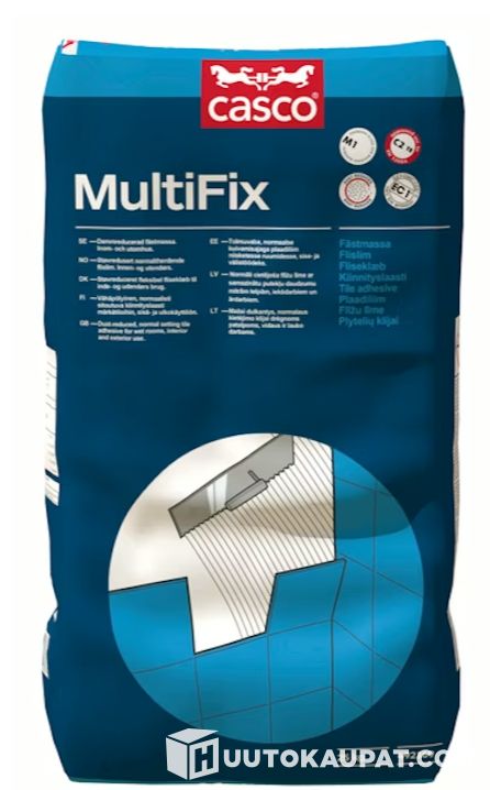 Multifix on M1-luokiteltu sementtipohjainen kiinnityslaasti keraamisille useiden laattamateriaalien kiinnitykseen seinillä ja lattiassa.