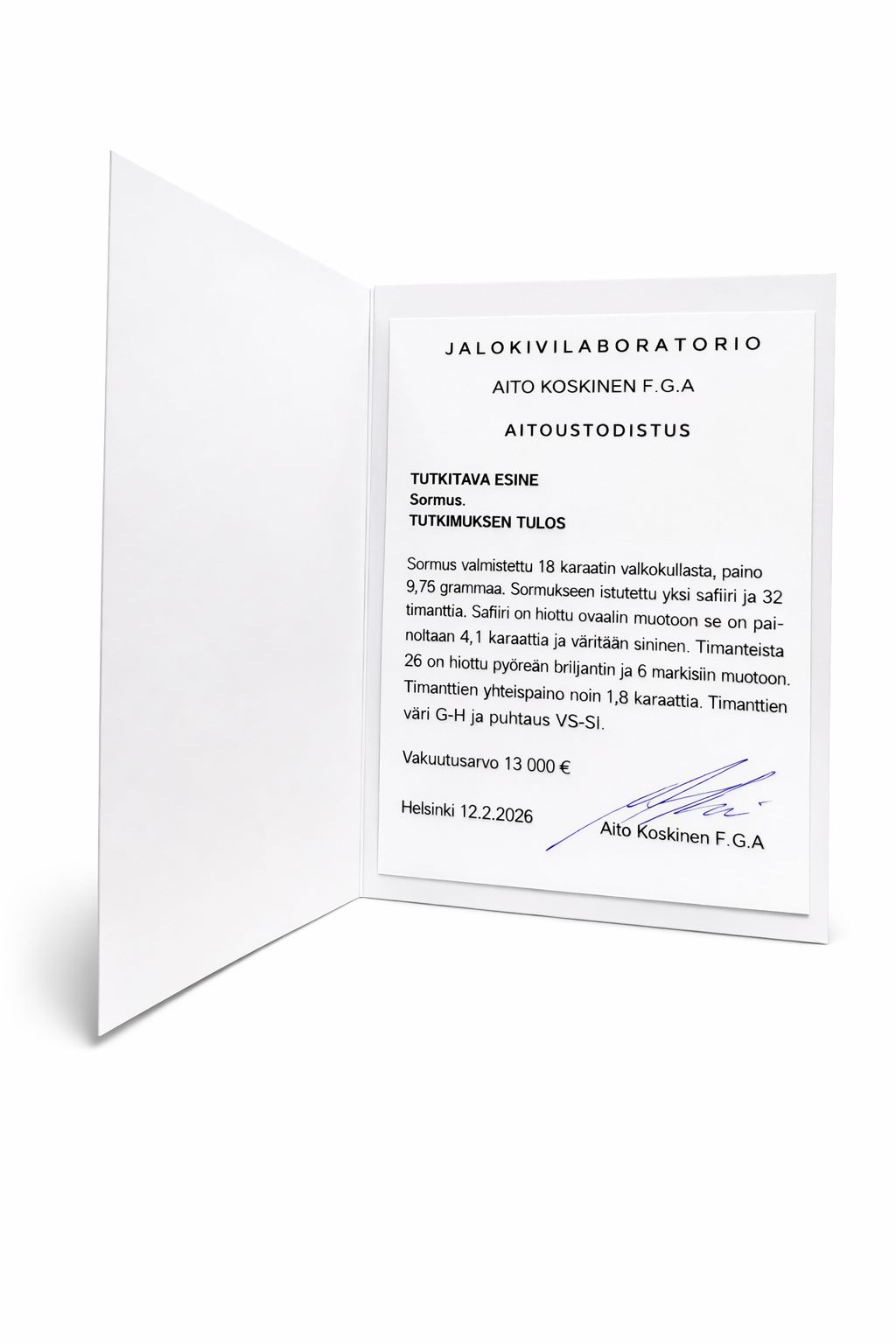 Aitoustodistus / gemmologin vakuusarvio