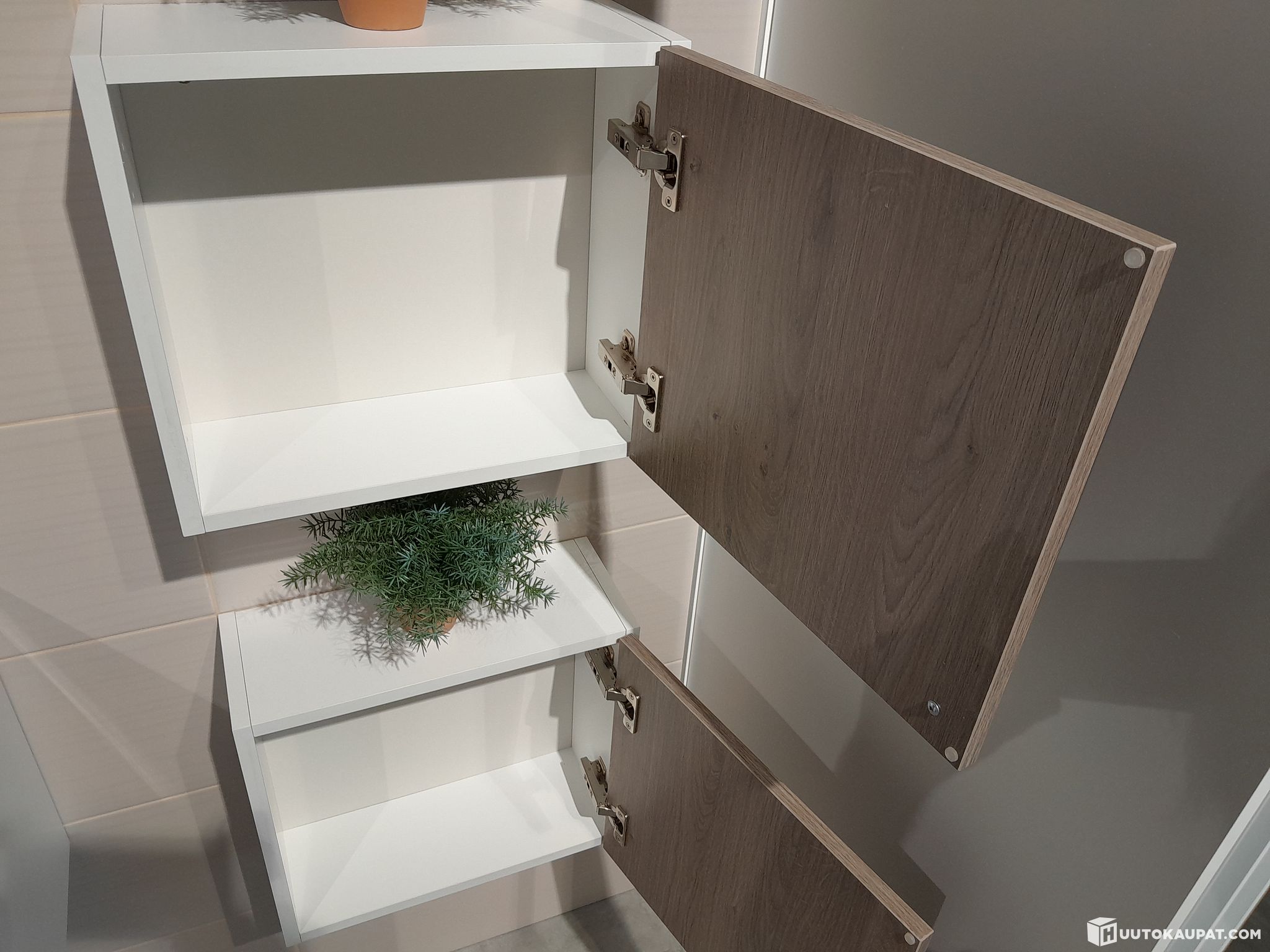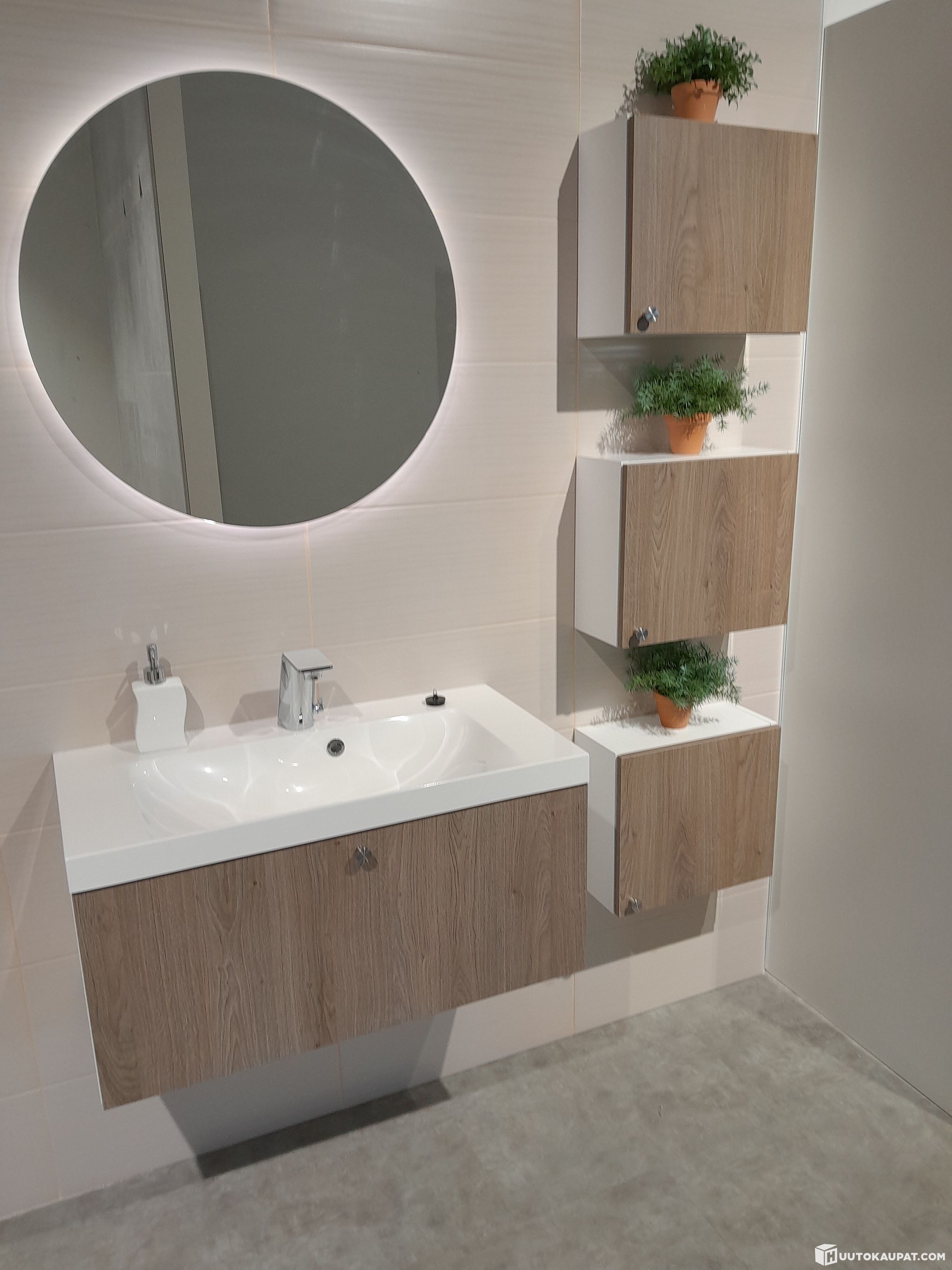 Novart kylpyhuonekalusteryhmä Saimi altaalla ja hanalla varustettuna (malliryhmä). Persoonallinen ryhmä valopeilillä ja kolmella pikkukaapilla. Laminaattiovissa tyylikäs tammen puunsyykuviointi johon valkoinen allas ja rungot tuovat kontrastia ja raikkautta. Kokonaisilmeen viimeistelee Oraksen hana: "Alessi Sense by Oras on elektroninen hana, jossa muotoilu ja estetiikka yhdistyvät helppokäyttöisiin toimintoihin ja vastuullisiin teknologioihin. Hana avataan painamalla sen yläosaa kevyesti, minkä jälkeen vettä virtaa kuusi sekuntia. Pitkän painalluksen jälkeen LED-valo syttyy hanan yläosassa ja vesi virtaa minuutin ajan, ellei hanaa suljeta uudelleen painamalla ennen sitä"