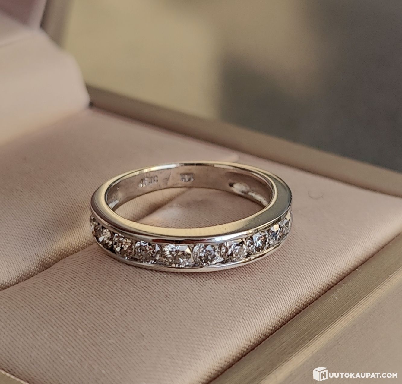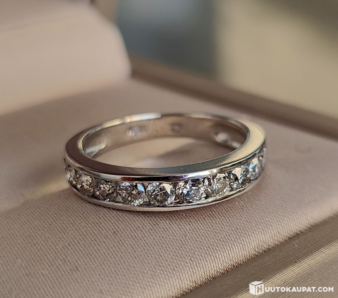 Ainoastaan pintanaarmuinen hyväkuntoinen 14k valkokultainen rivitimanttisormus - ilman pohjahintaa!