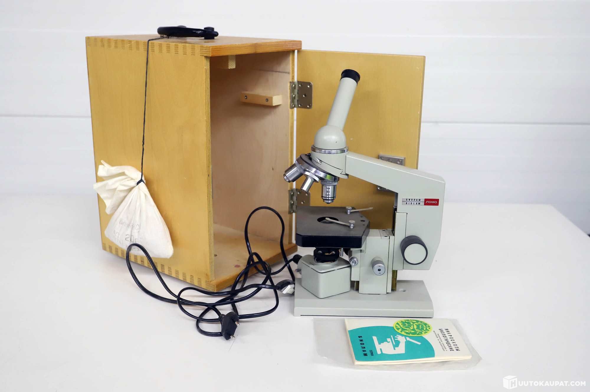Lomo Biolam-mikroskooppi vanerilaatikolla.