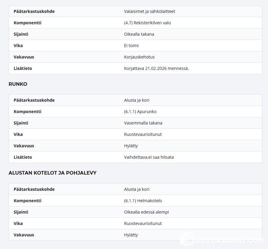 Auto ei ole ollut toimestamme teknisessä kuntotarkastuksessa eikä kaikkien varusteiden