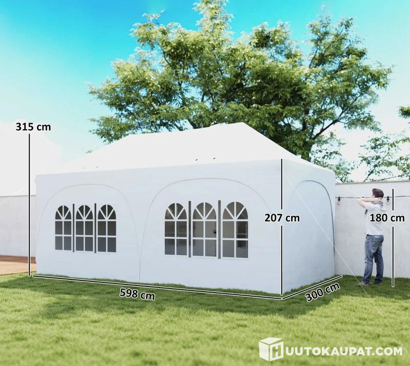 Tilava 3 x 6 m pop-up-paviljonki juhla- ja tapahtumakäyttöön. Harjakattoinen malli kaari-ikkunoilla ja irrotettavilla sivuseinillä. Mukana täydellinen kiinnityssarja ja hiekkapainot. Pinta-ala 18 m².
