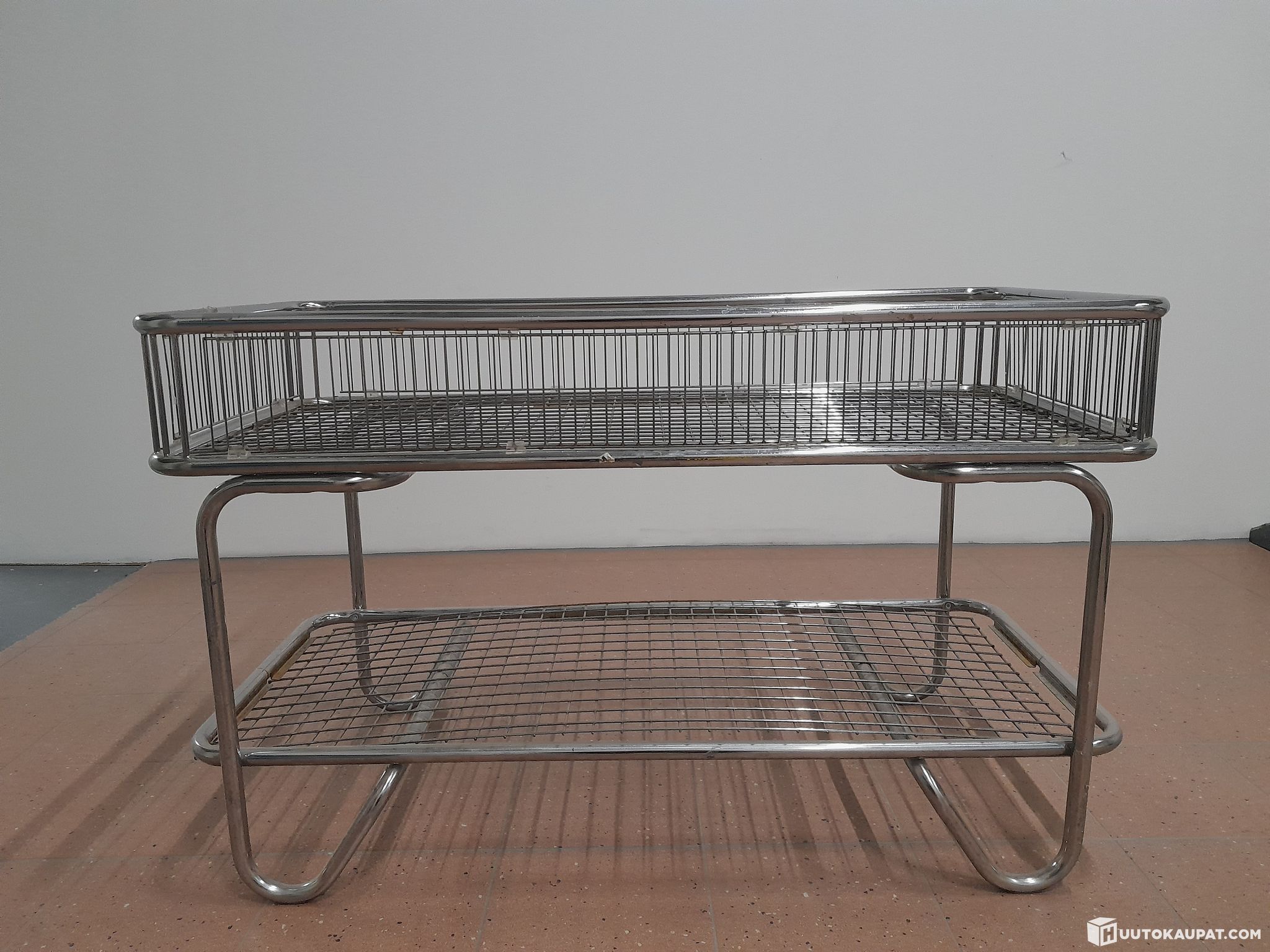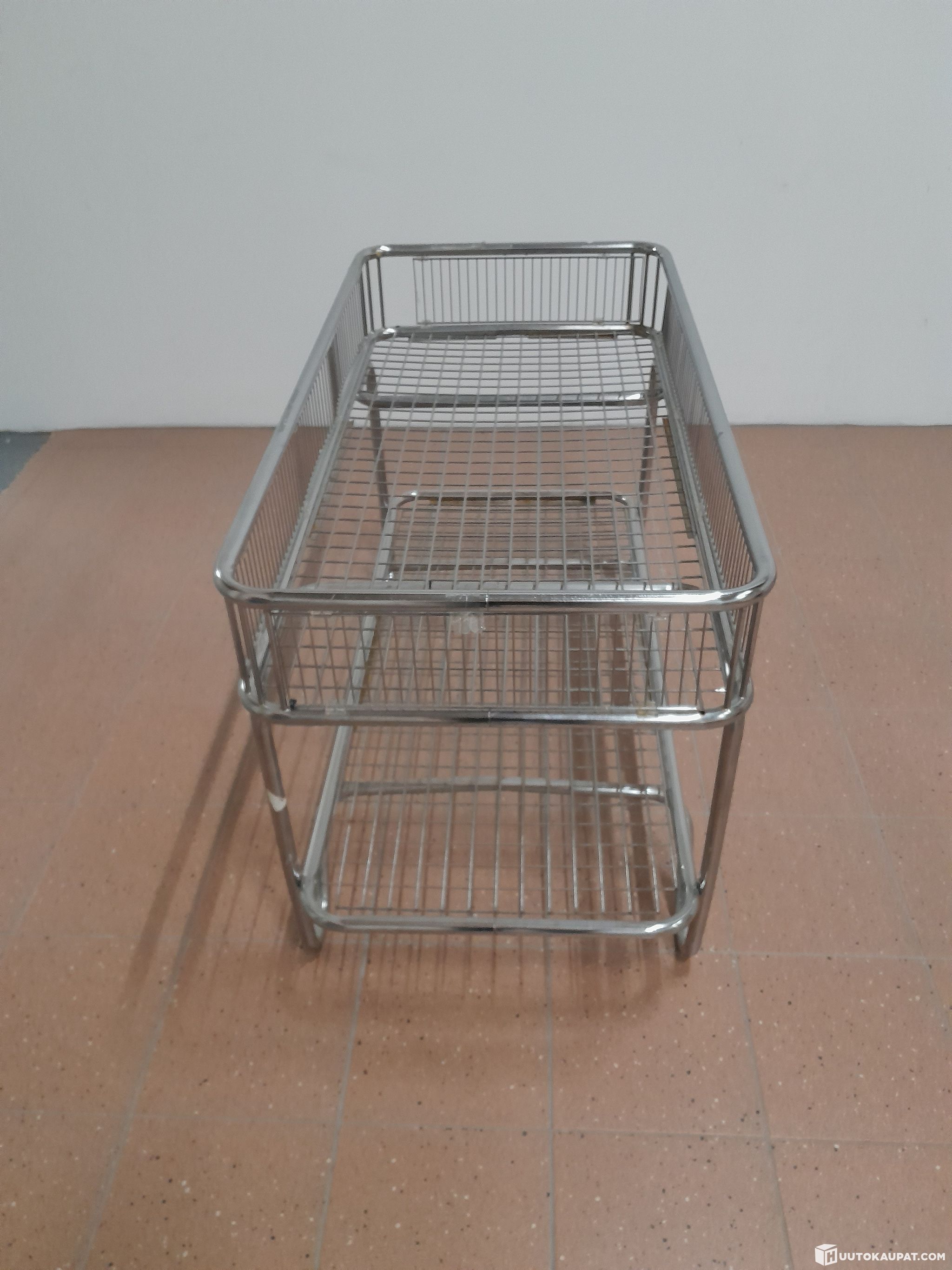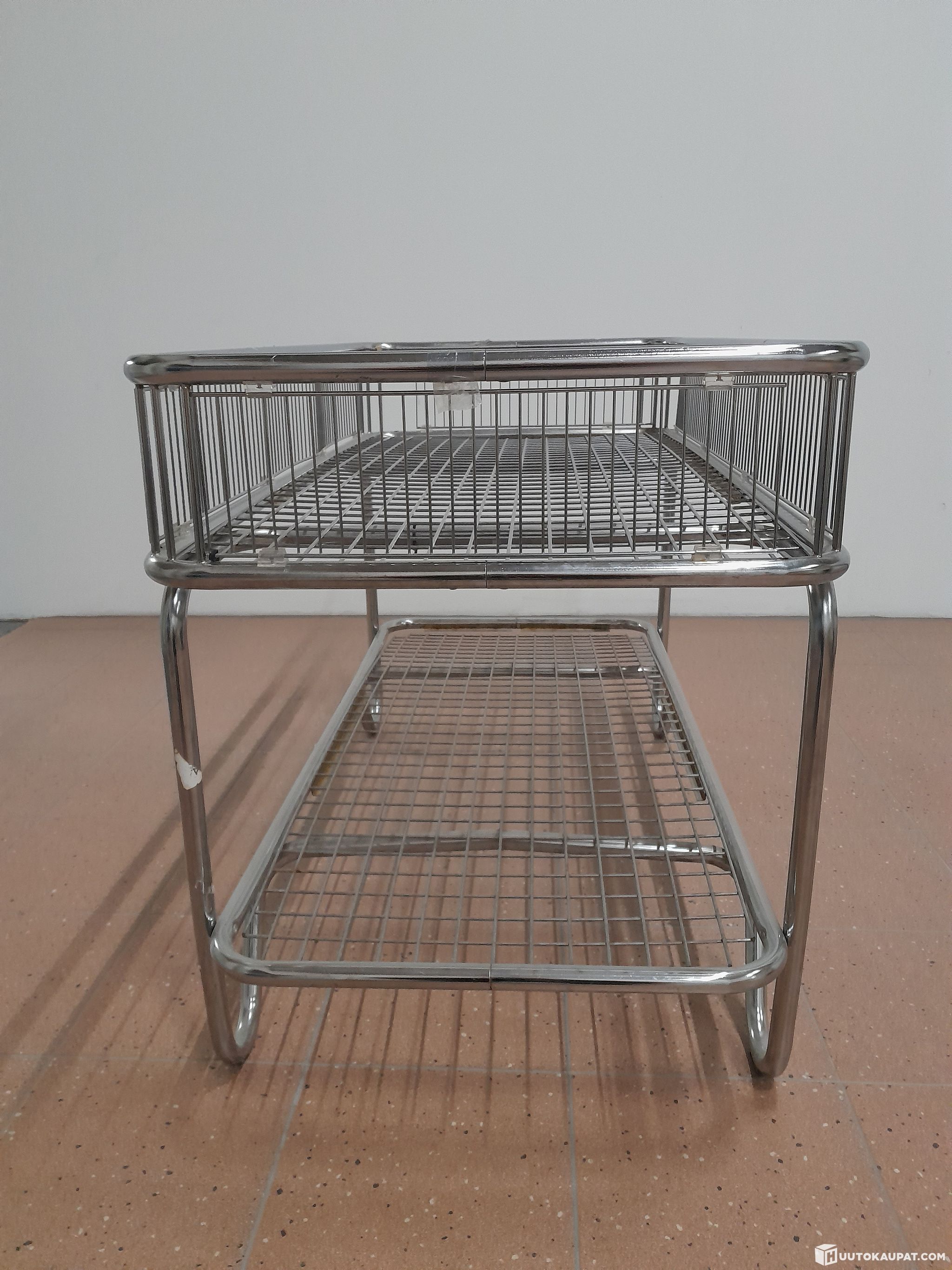 Käytettyjä, metallisia myymäläkalusteita neljä kappaletta. Mitat korkeus 80 cm, leveys 65 cm ja pituus 130 cm. Laidan korkeus 18 cm.