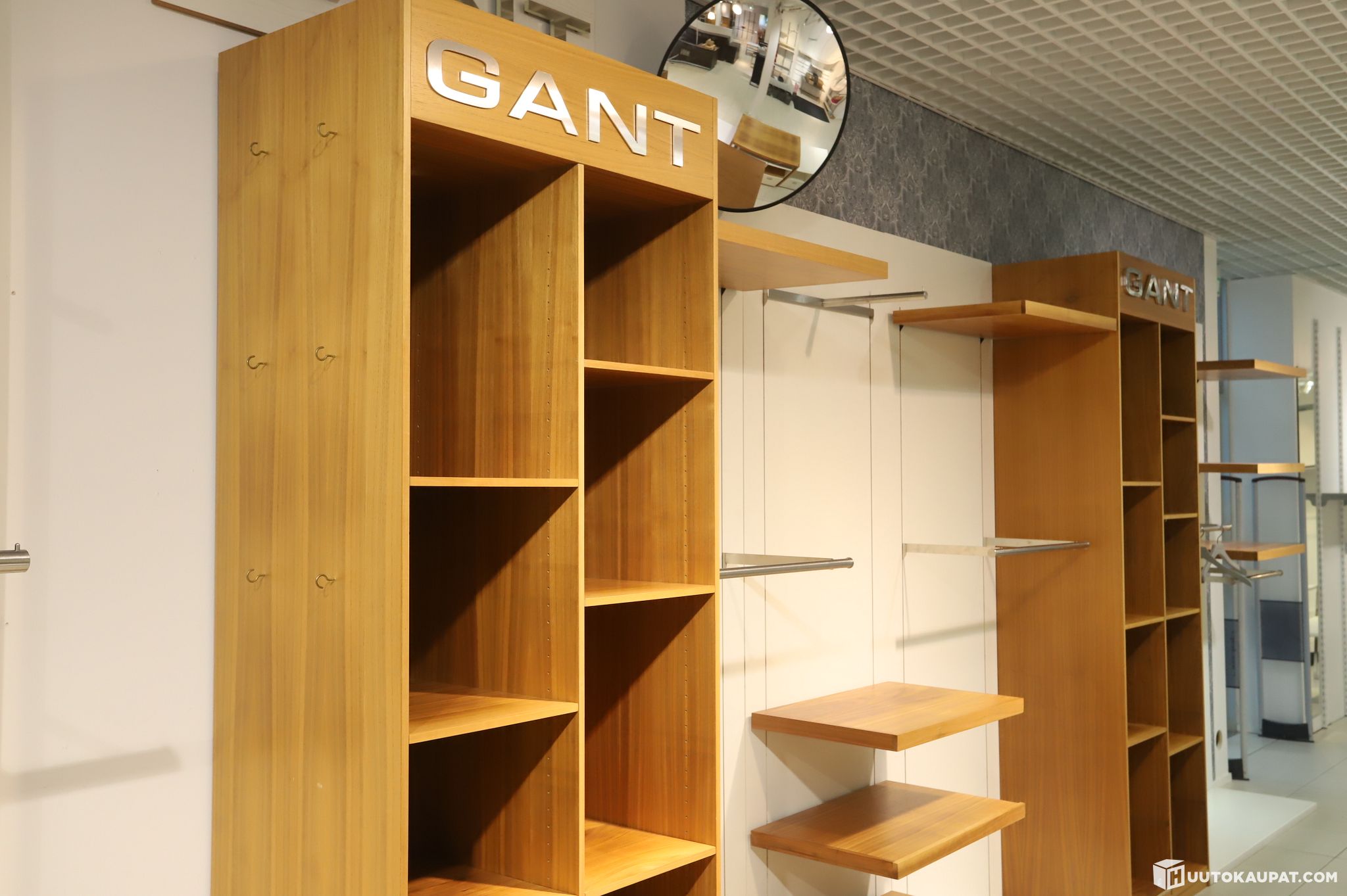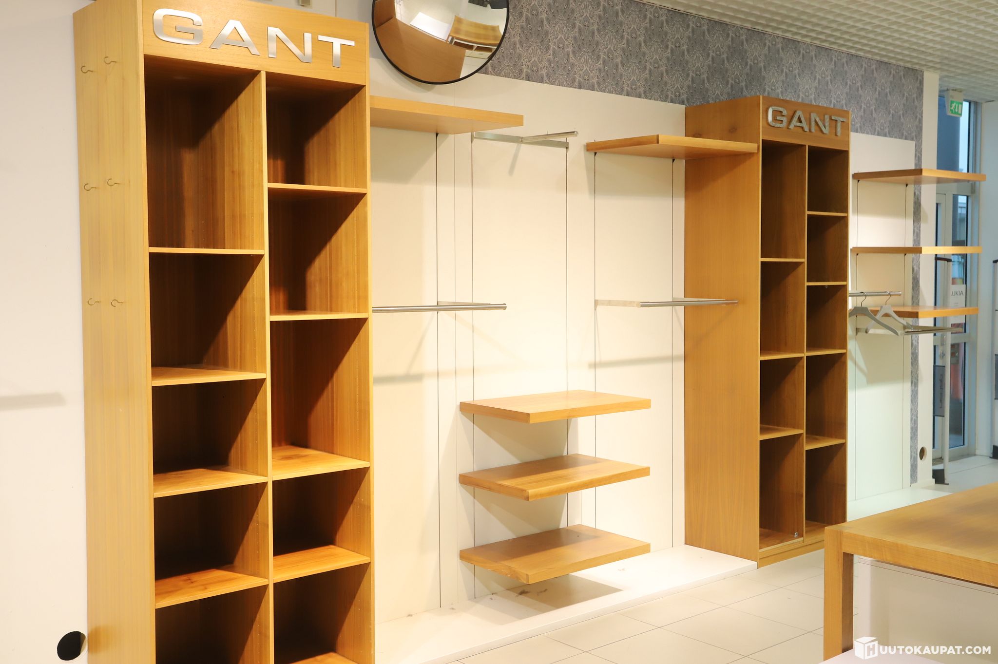 Erittäin näyttävä ja laadukas GANT-myymäläkalustekokonaisuus. Sisältää brändätyt puukaapit, avohyllyt sekä ripustustangot, jotka muodostavat yhtenäisen ja ammattimaisen esillepanoseinän.