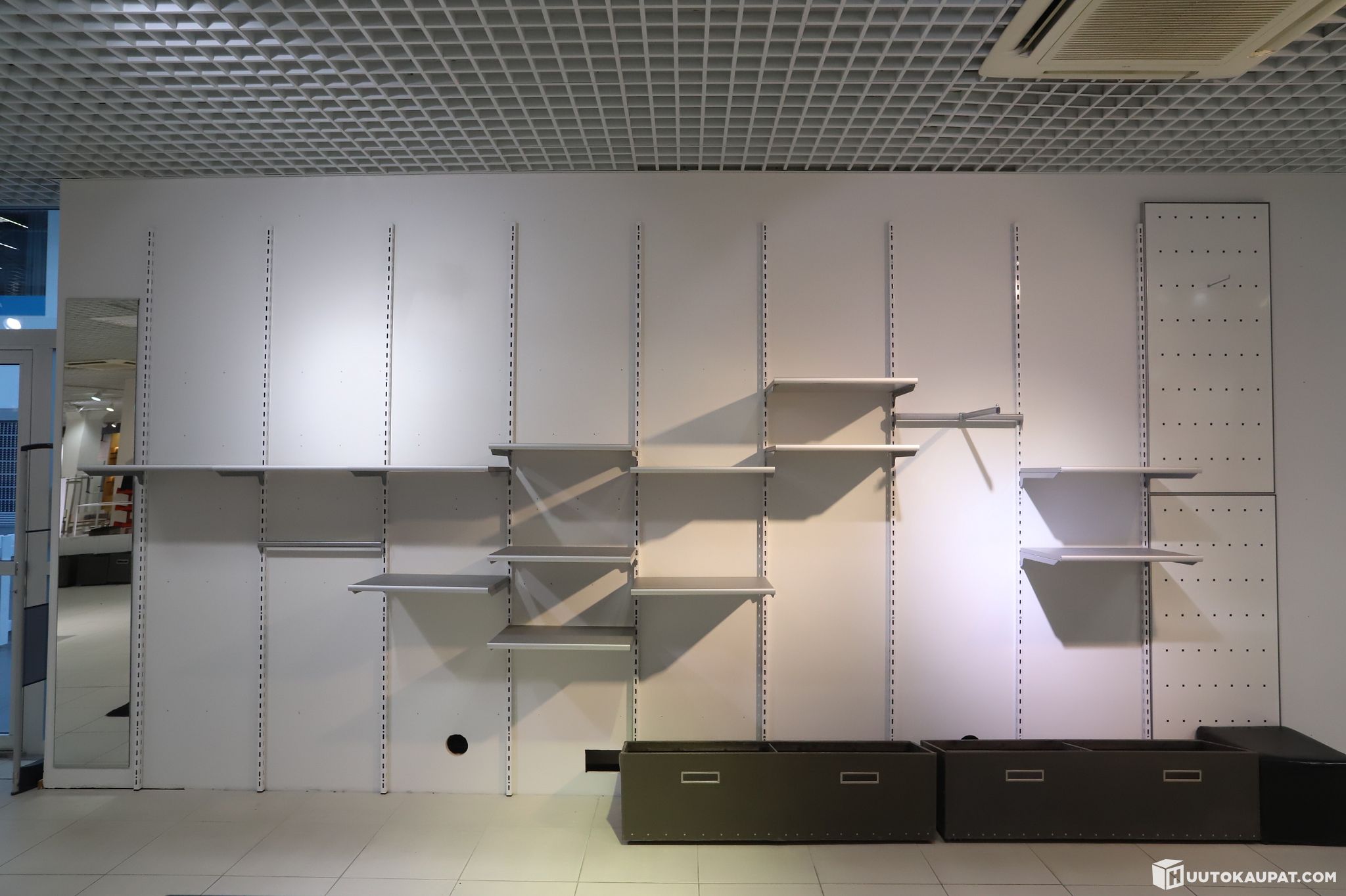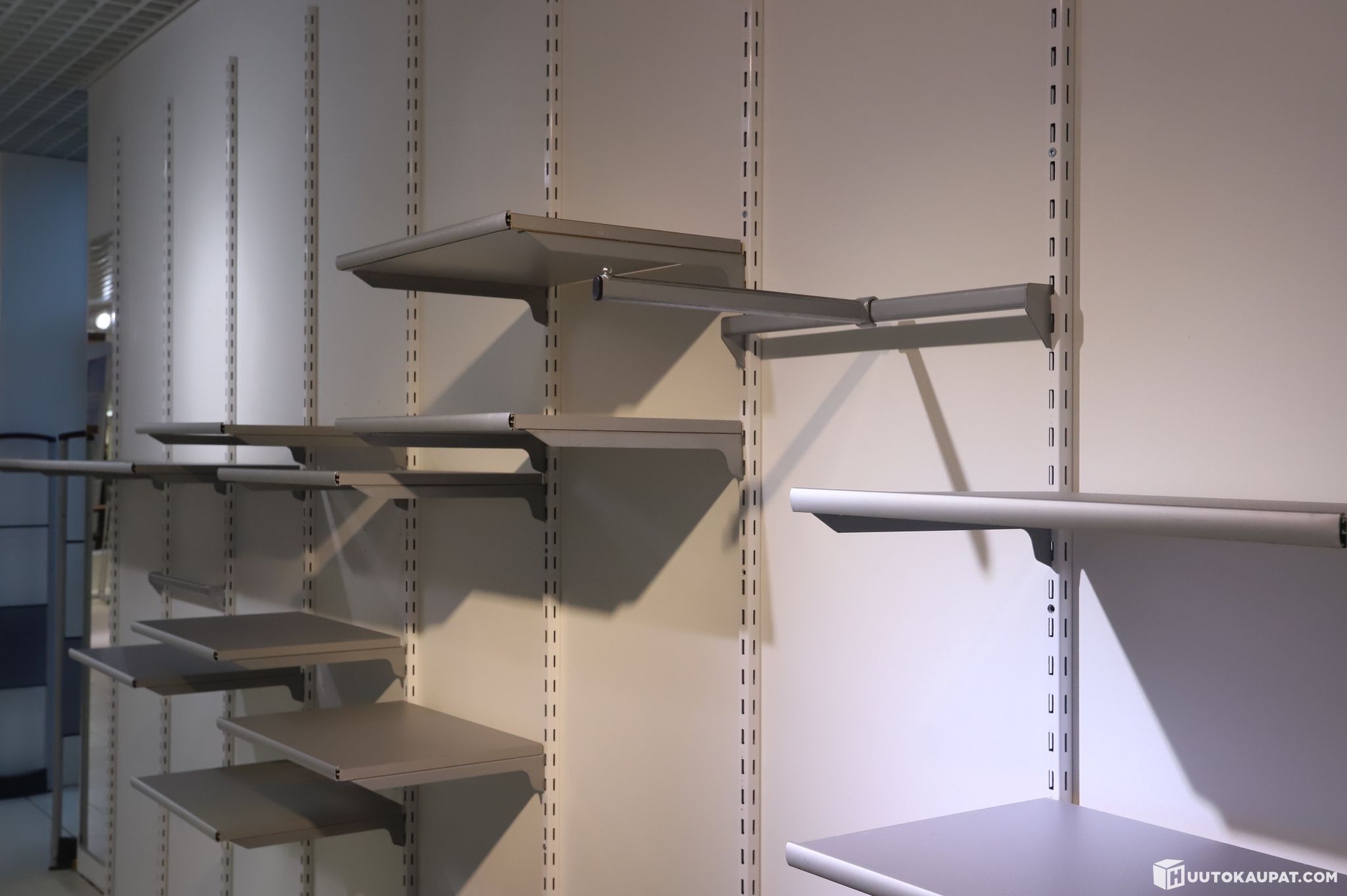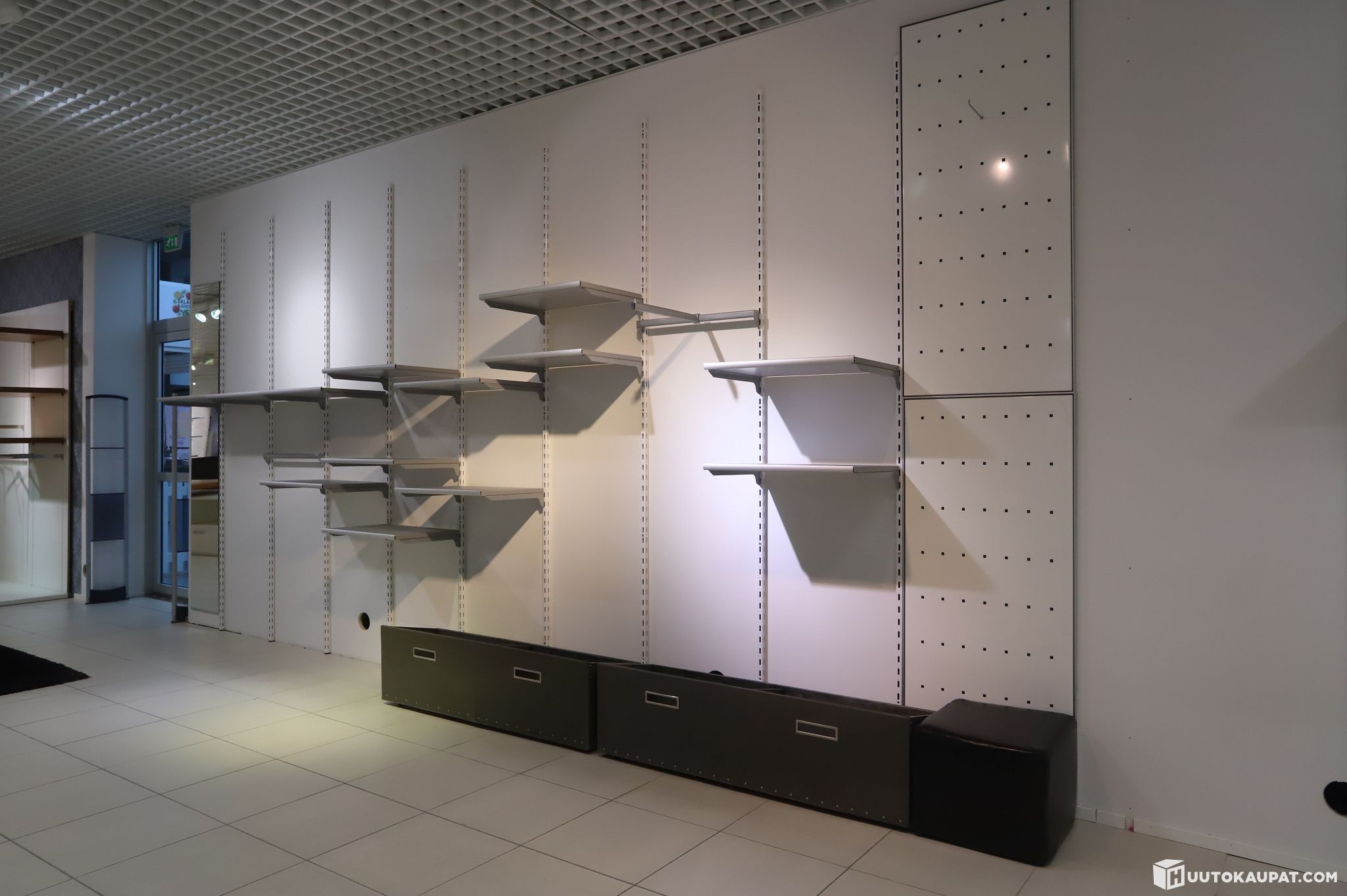 Purettu seinähyllykokonaisuus. Kasattuna kokonaisuuden mitat ovat noin k 270 cm ja l 540 cm (mitat koskevat hyllyjärjestelmää). mukana kaikki kuvissa näkyvä irtaimisto, kuten laatikot, kannattimet, hyllyt, koukut ja muu hyllyihin liittyvä tavara.