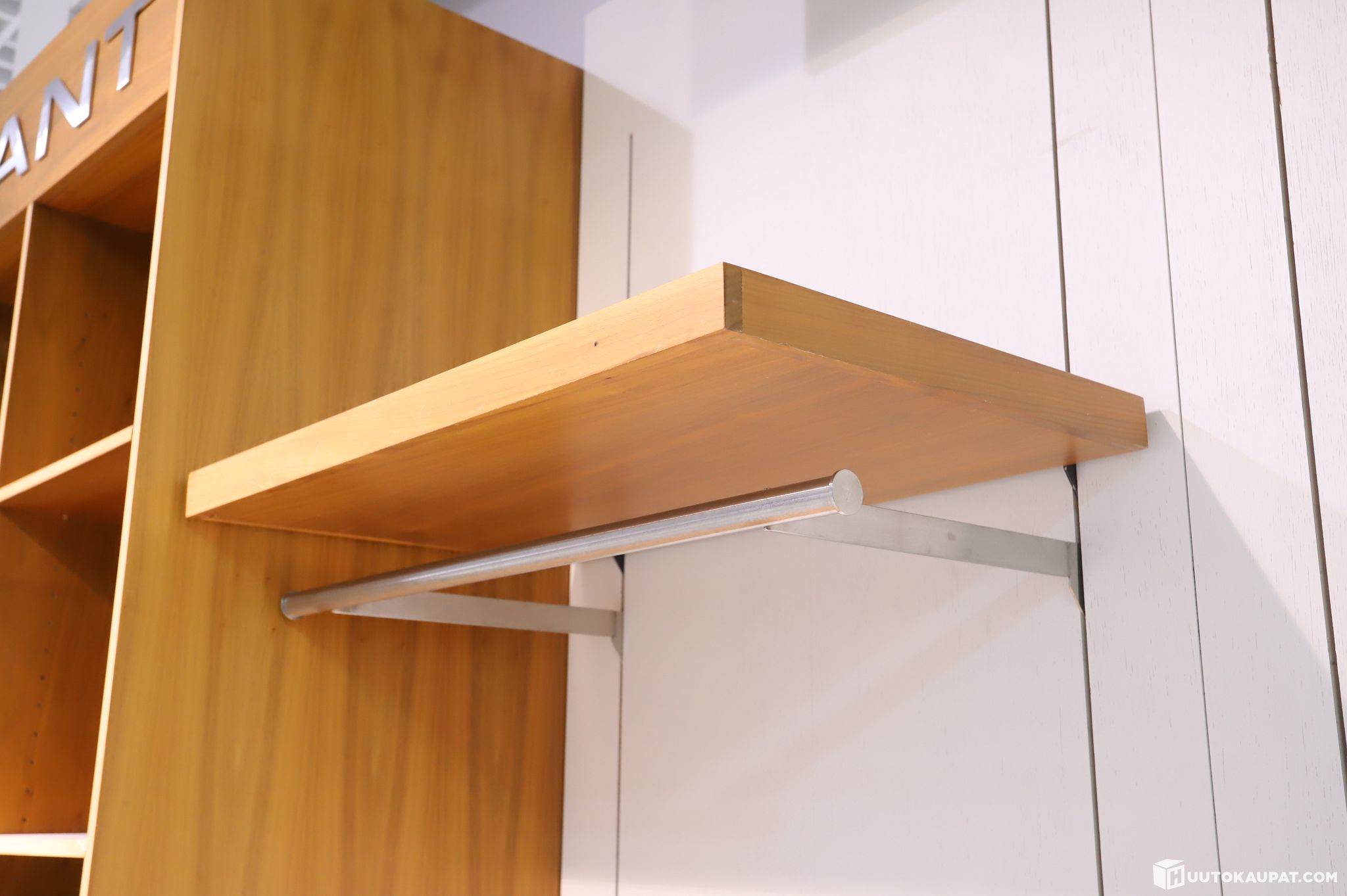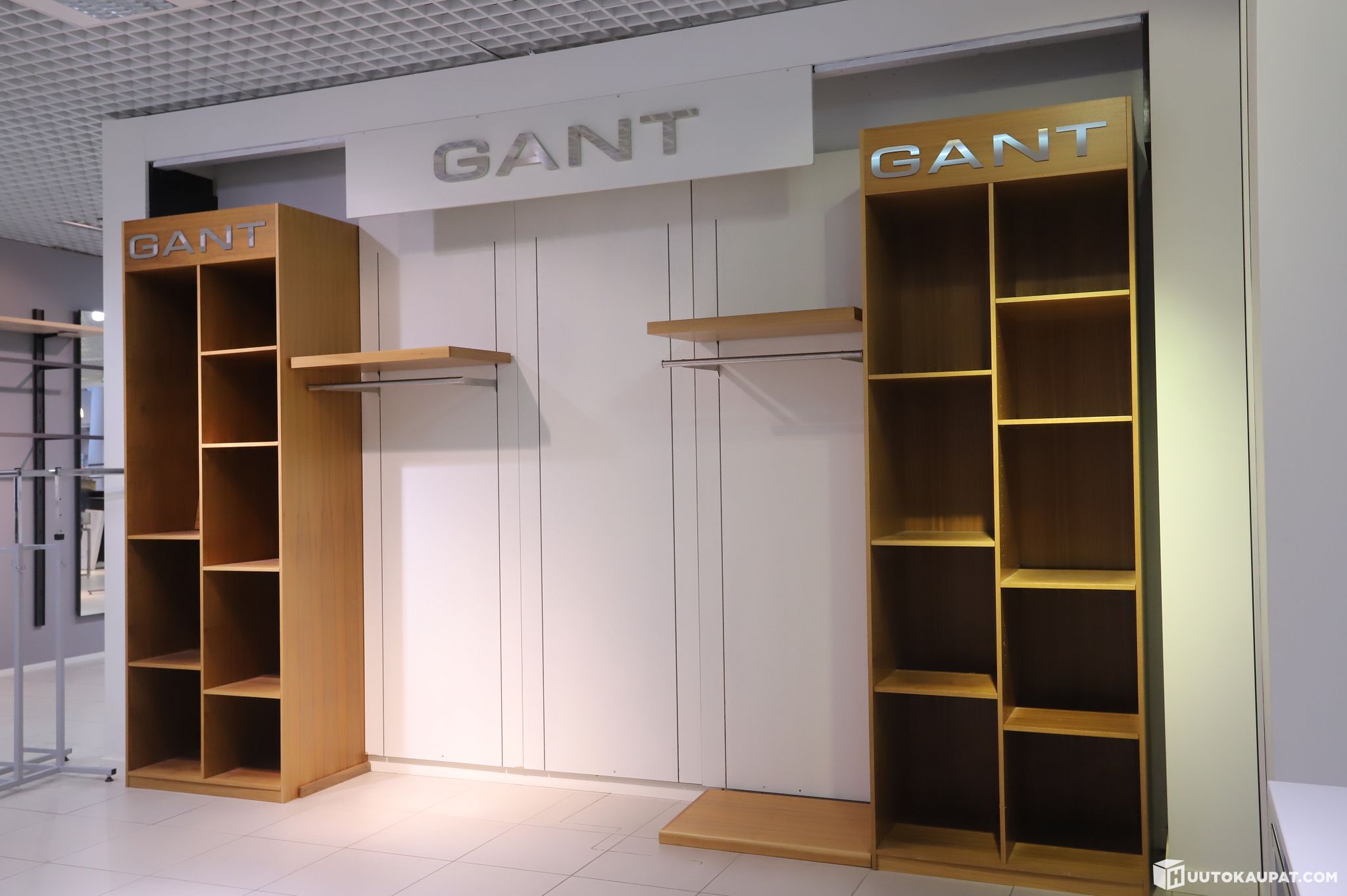 Näyttävä gant-myymäläkokonaisuus, joka sisältää kaksi korkeaa puista hyllykaappia, seinäpaneelit, vaatetangot, tasot sekä yläpuolisen gant-logolla varustetun kylttielementin.