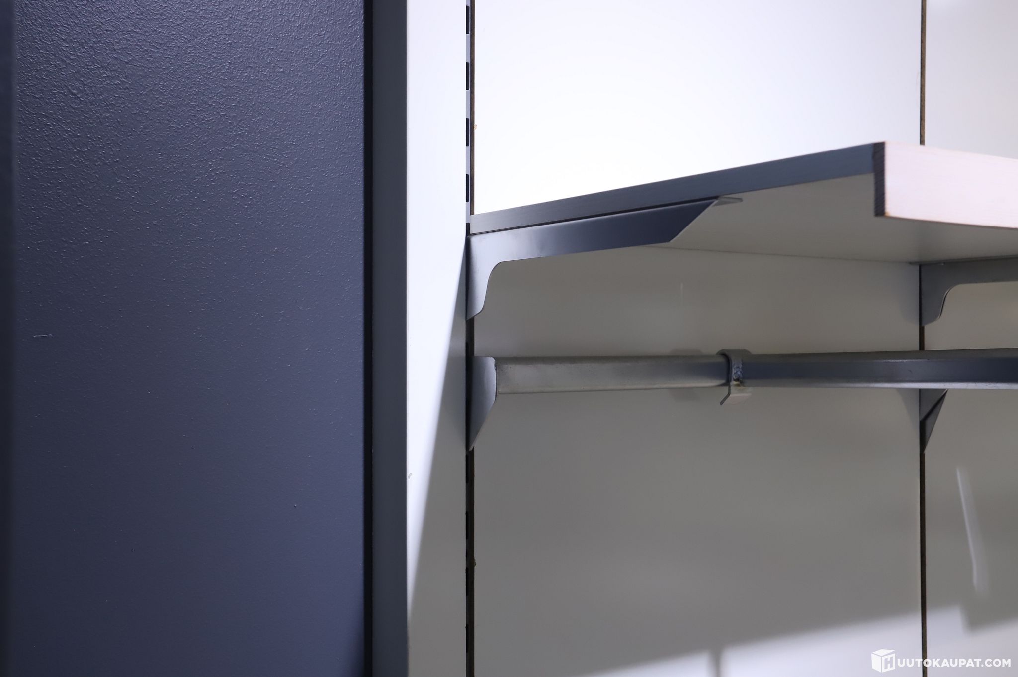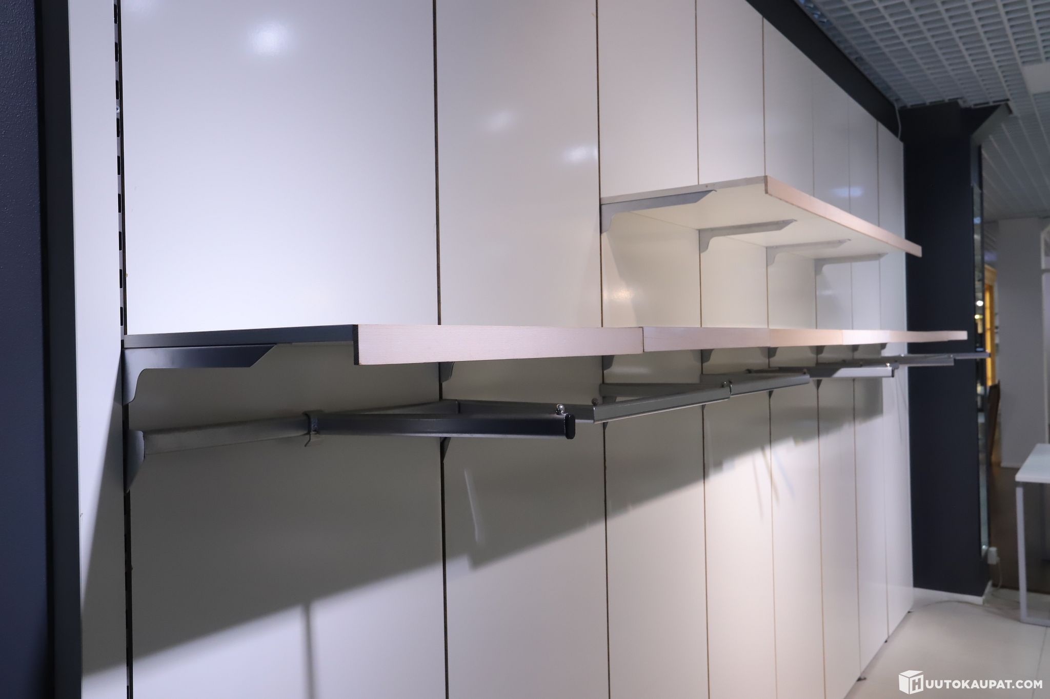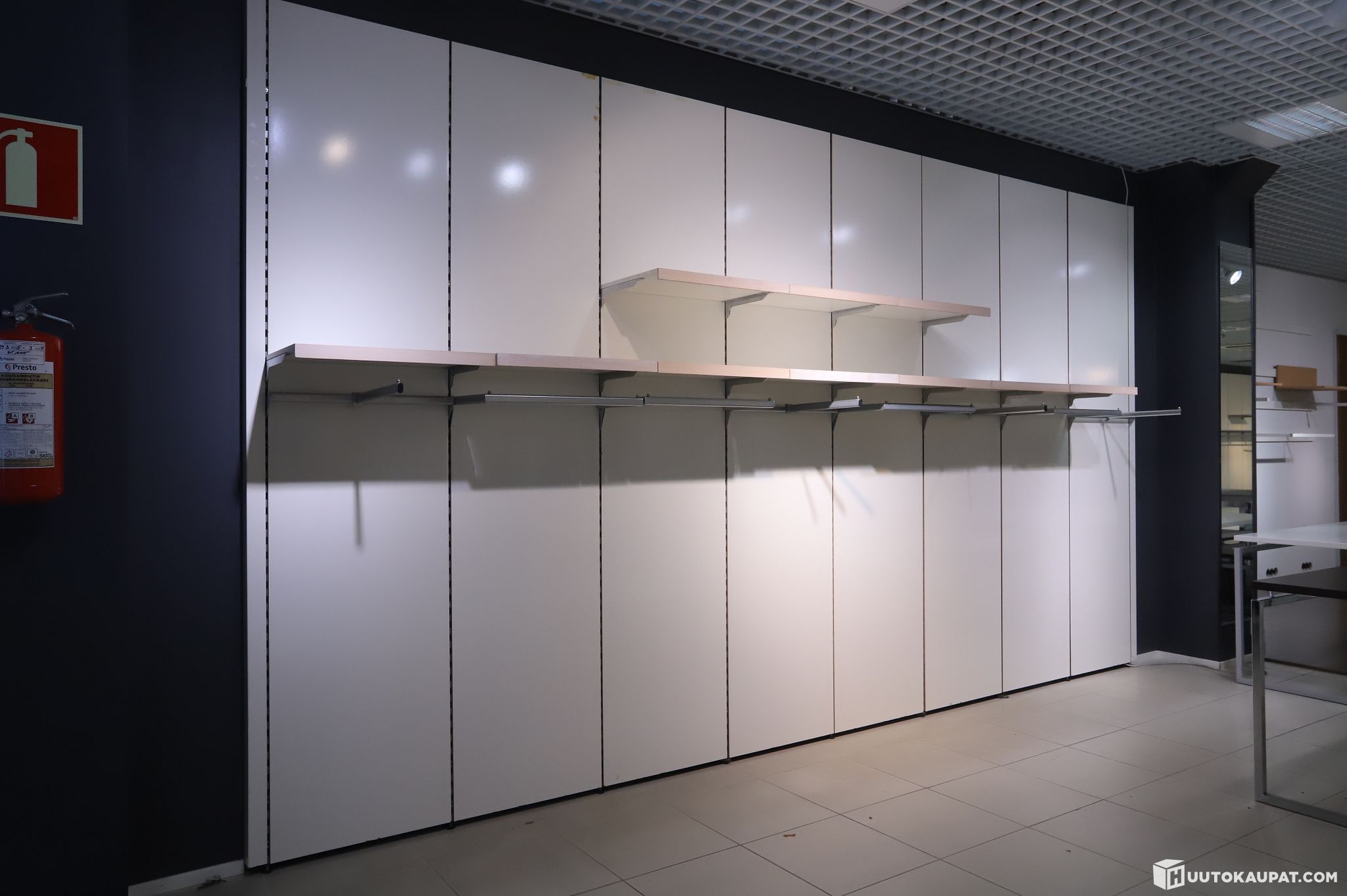 Suuri kokoinen myymälän seinäelementti hyllytasoilla. Erinomainen vaatteiden esillepanoon. Noudetaan purettuna !