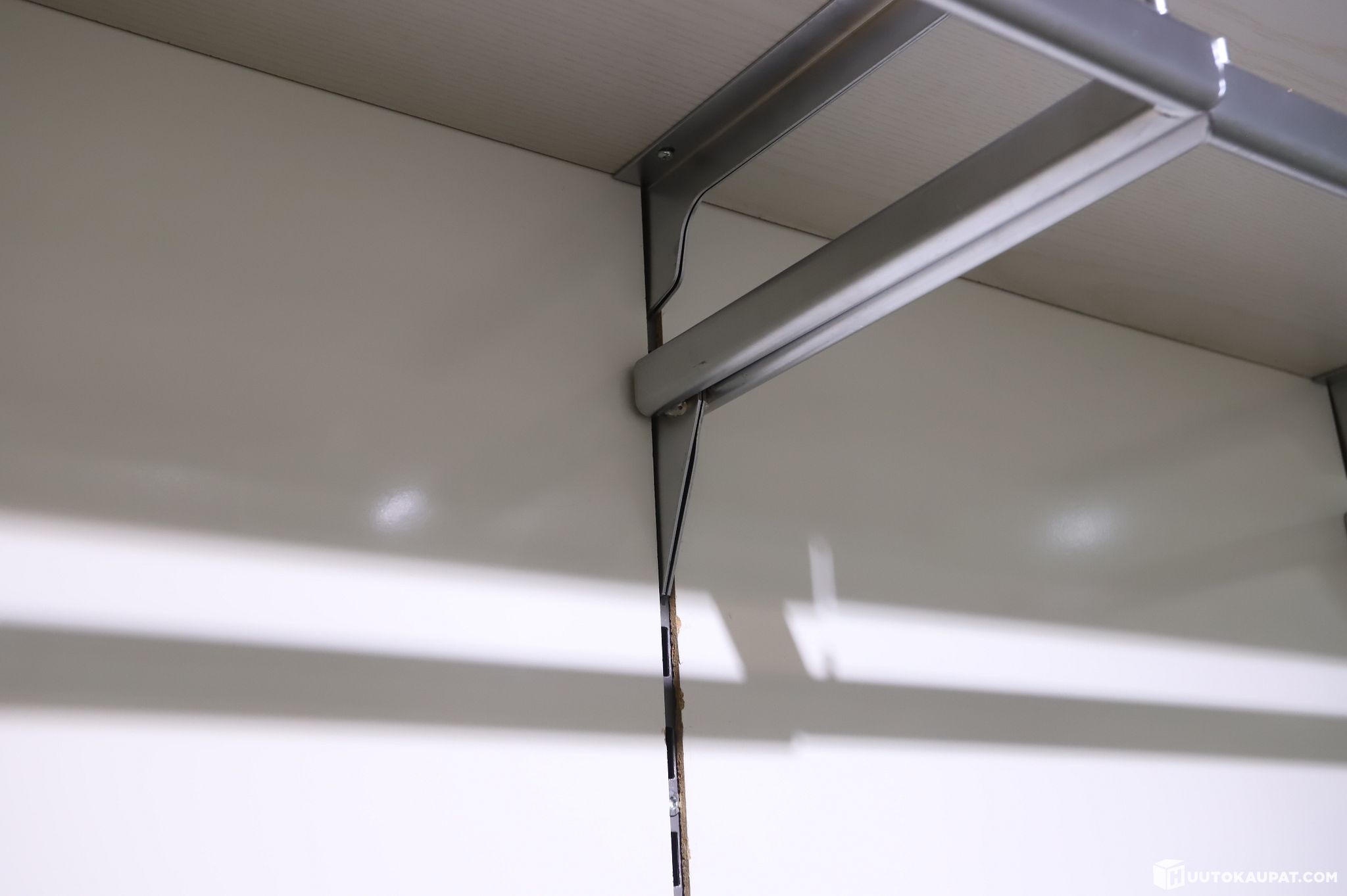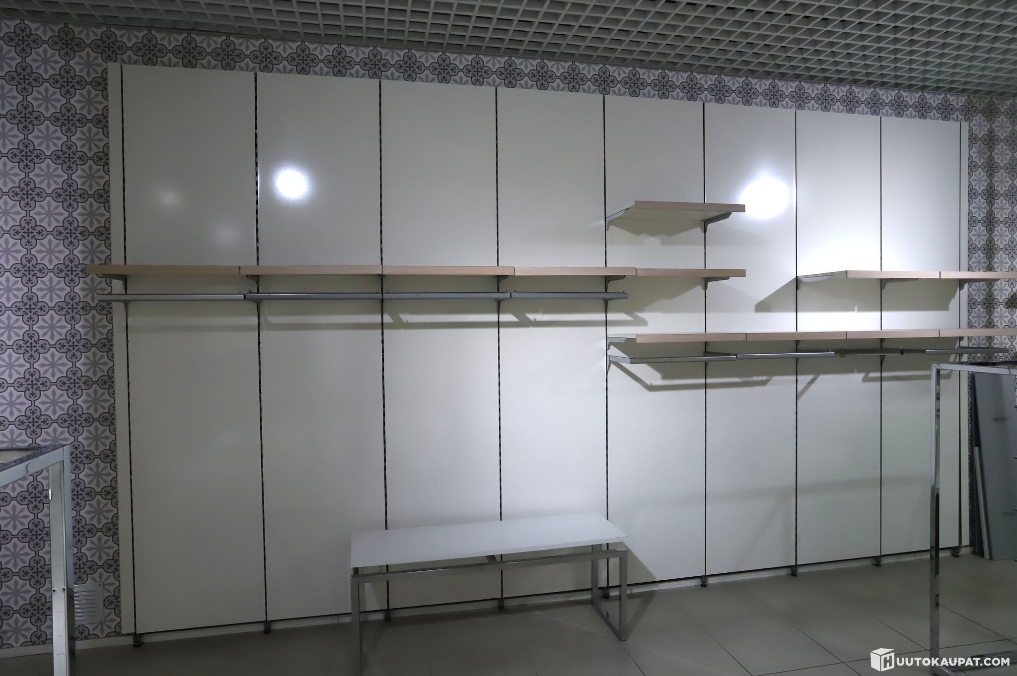 Suuri erä myymälän seinään kiinnitettävää hyllyjärjestelmää. Huom: kaksi eri kokoista seinää. Noudetaan purettuna.
