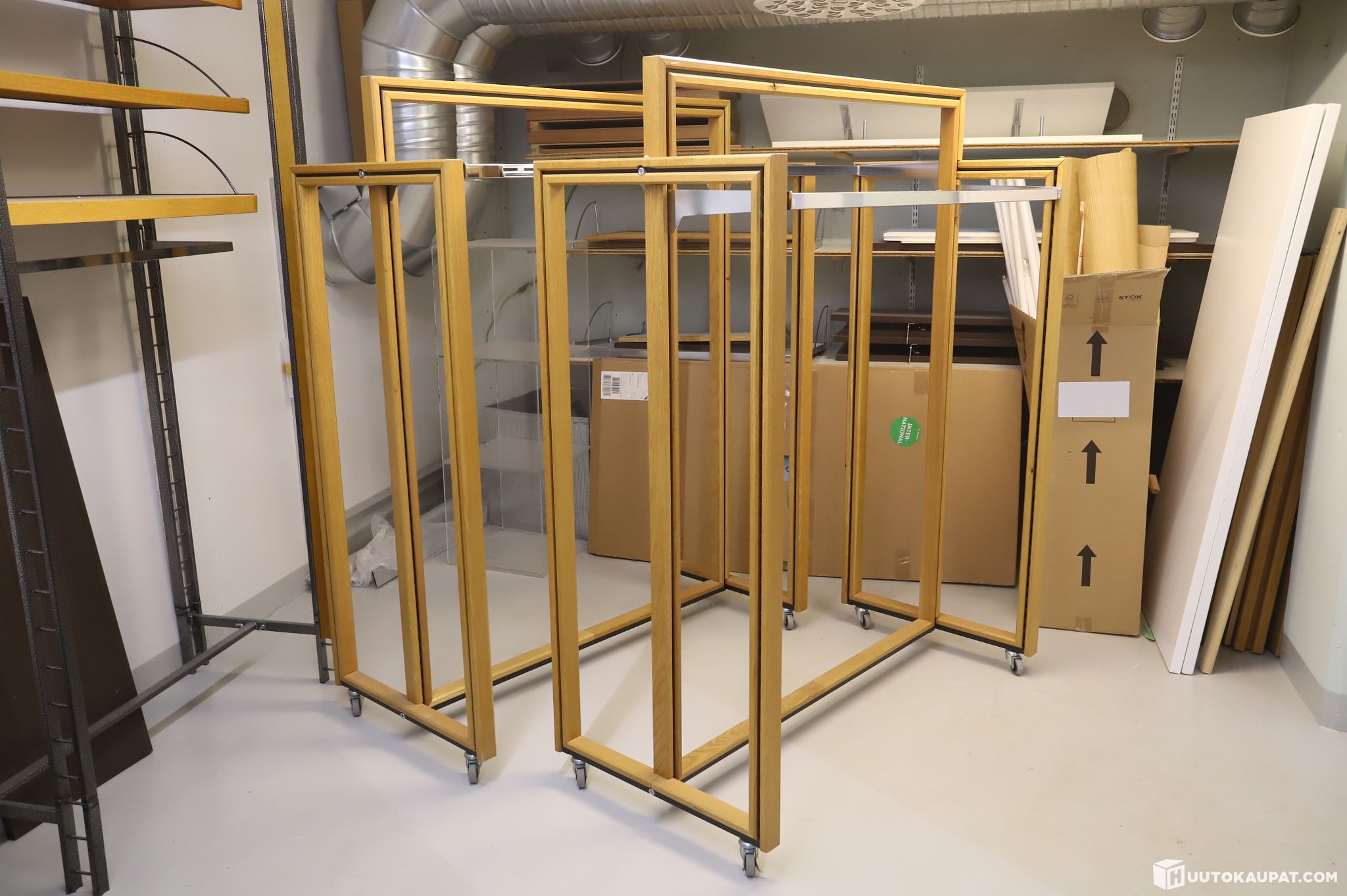 Laadukkaat ja viimeistellyt puiset vaaterekit, jotka sopivat erinomaisesti myymäläympäristöön, showroomiin tai esillepanoon. Ajaton puurunko yhdistettynä metallisiin vaatetankoihin luo siistin ja arvokkaan ilmeen. Kevyesti rullaavat pyörät tekevät rekistä helpon siirtää ja muokata tilan mukaan. Kaksi kappaletta kuvan mukaisia rekkejä.
