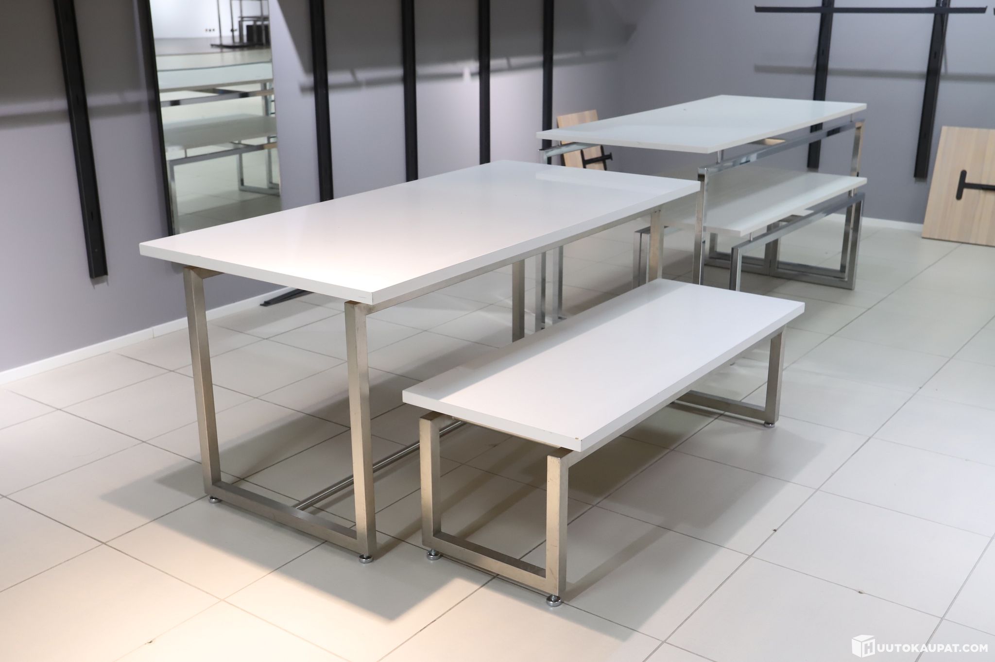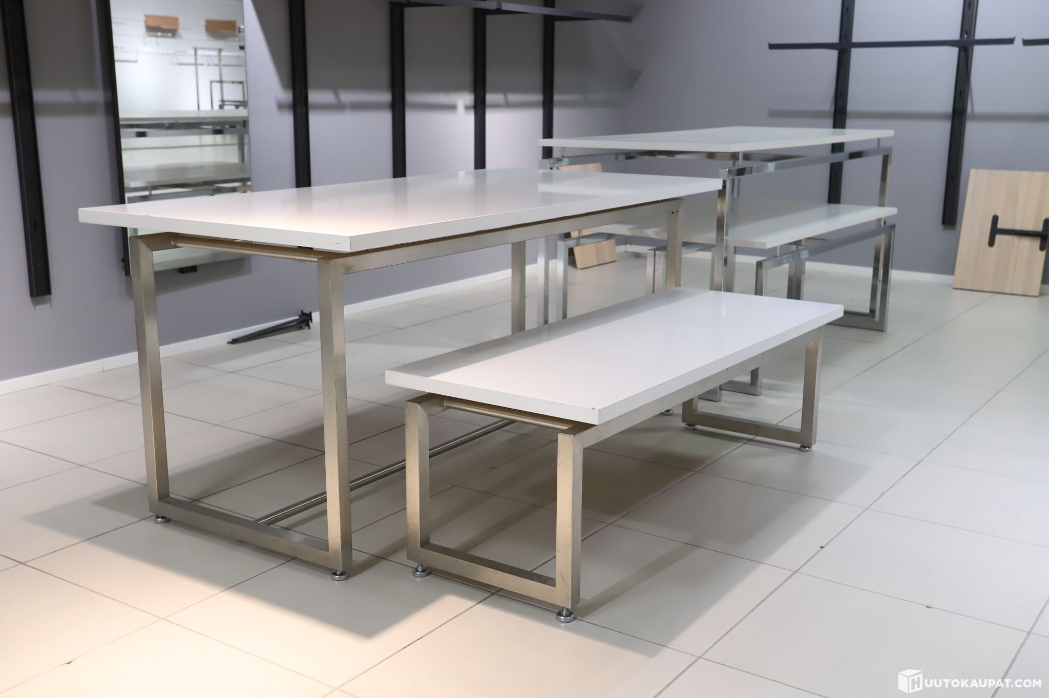 Tyylikkäät myymälän pöydät ja penkit. Soveltuu niin vaatteiden esillepanoon, kuin istumiskäyttöön. Setissä kolme penkkiä ja kaksi pöytää.