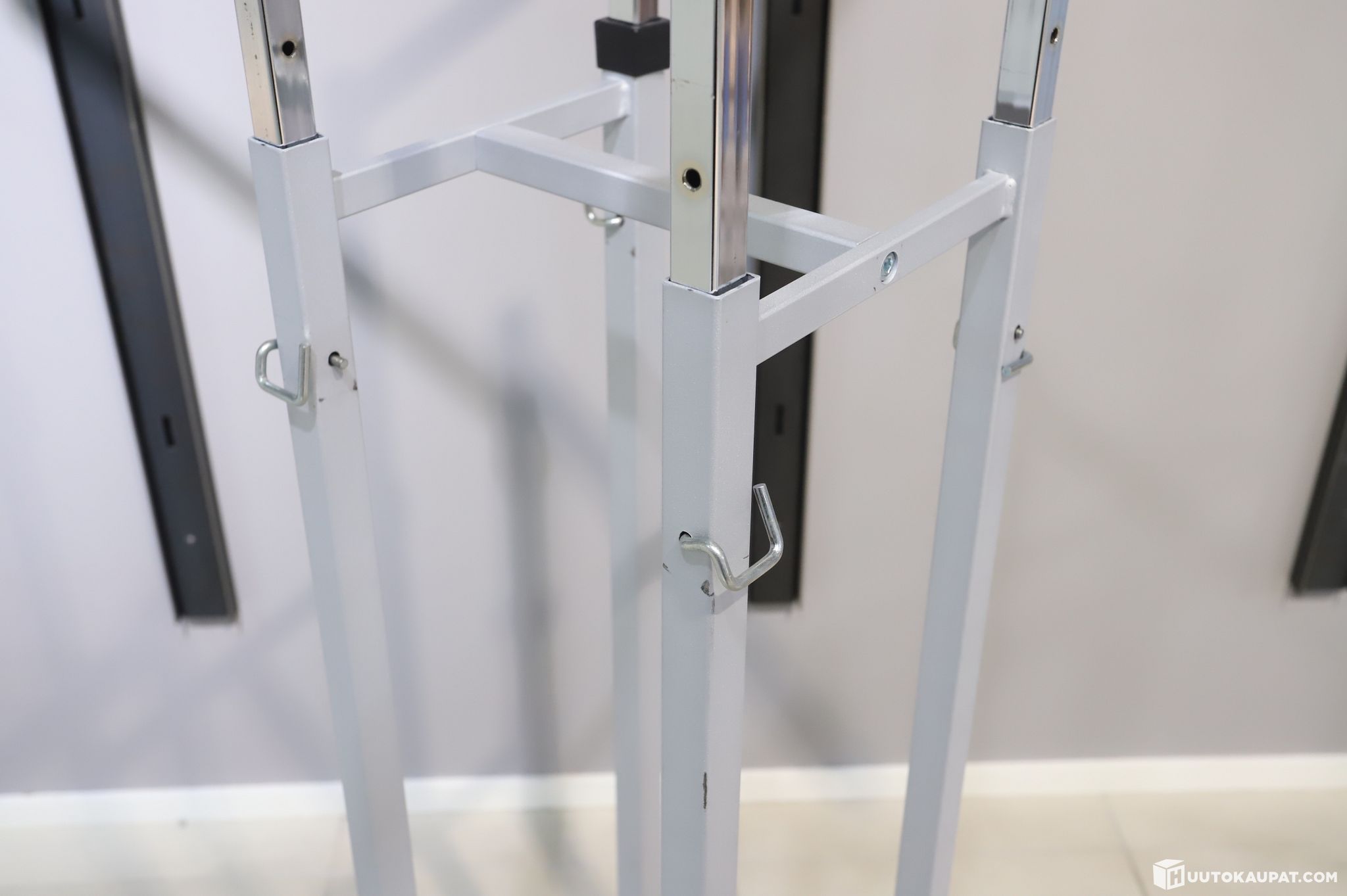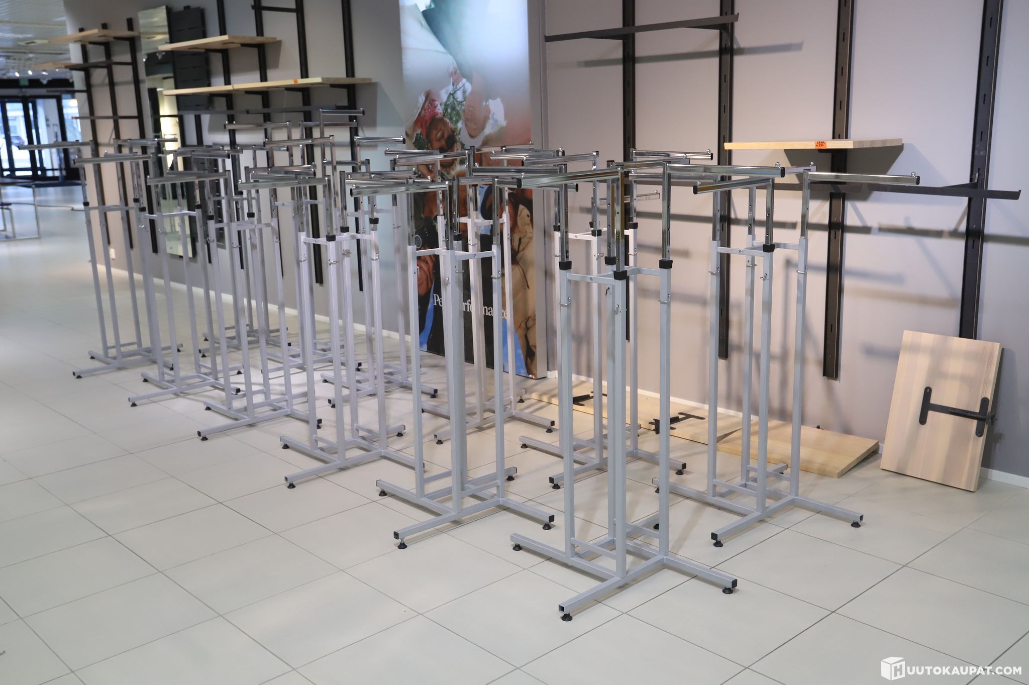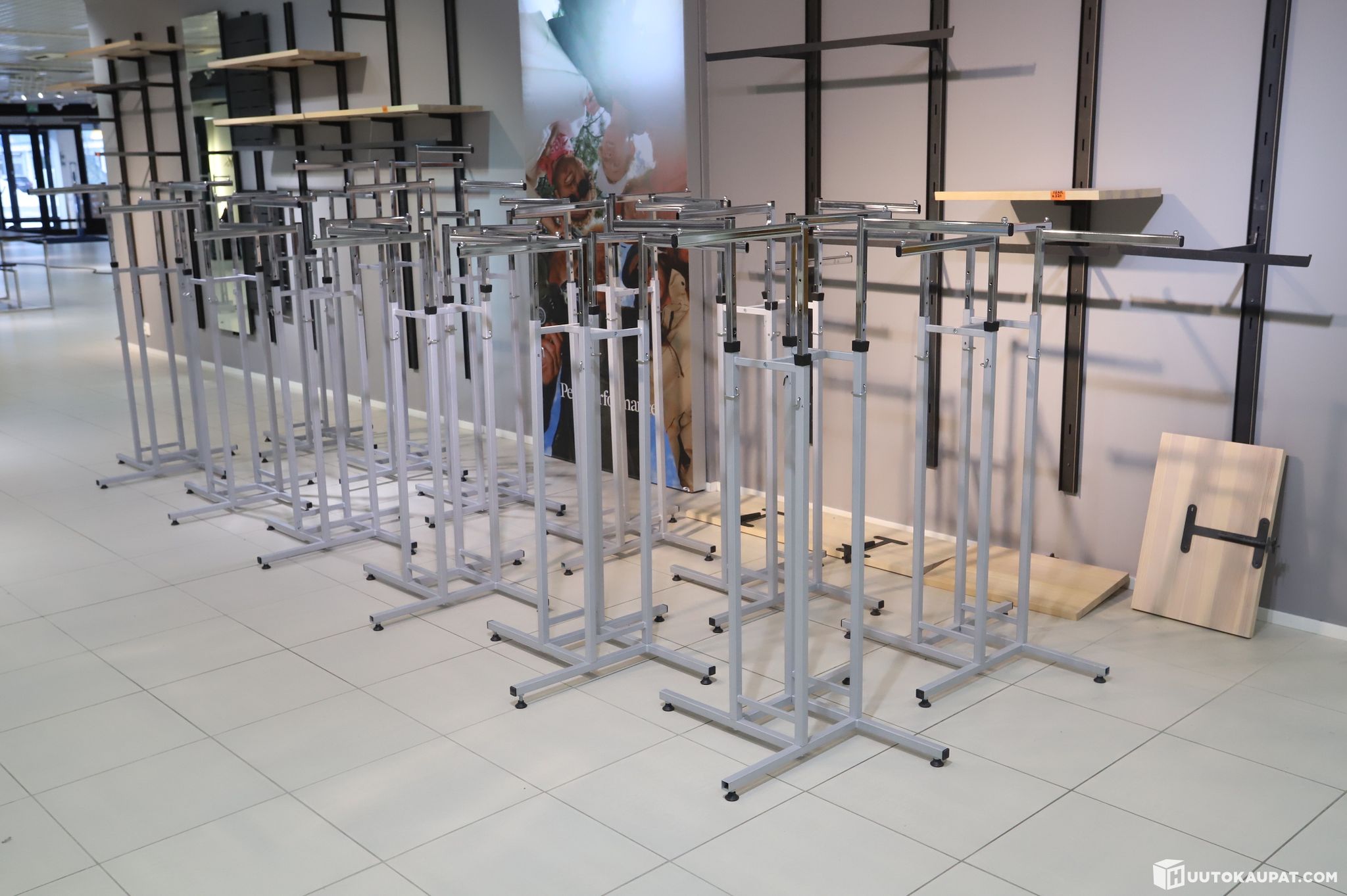 12kpl erä myymälän vaatetelineitä / rekkejä. Korkeus on säädettävä.