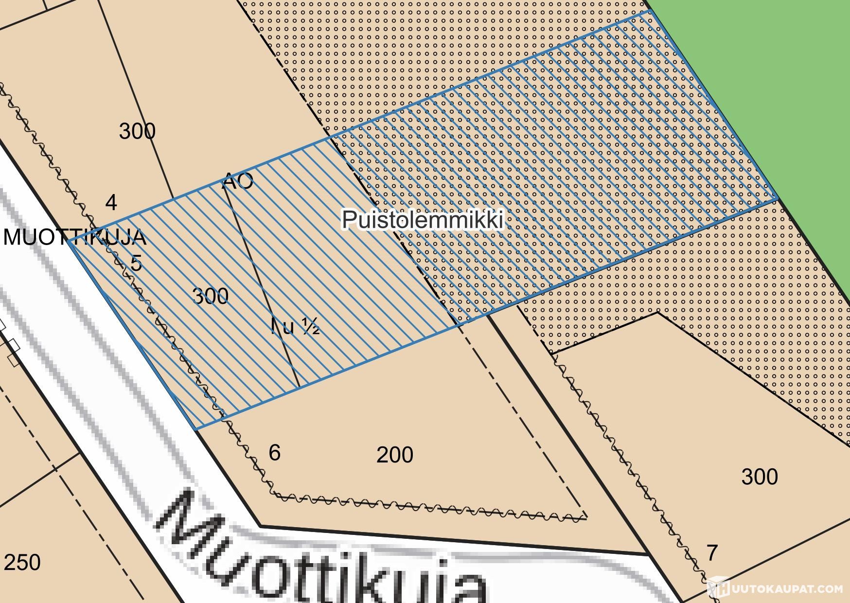 Muottikuja 6 -osoitteessa sijaitseva omakotitontti on kooltaan 2374 m² ja rakennusoikeutta on 300 k-m².