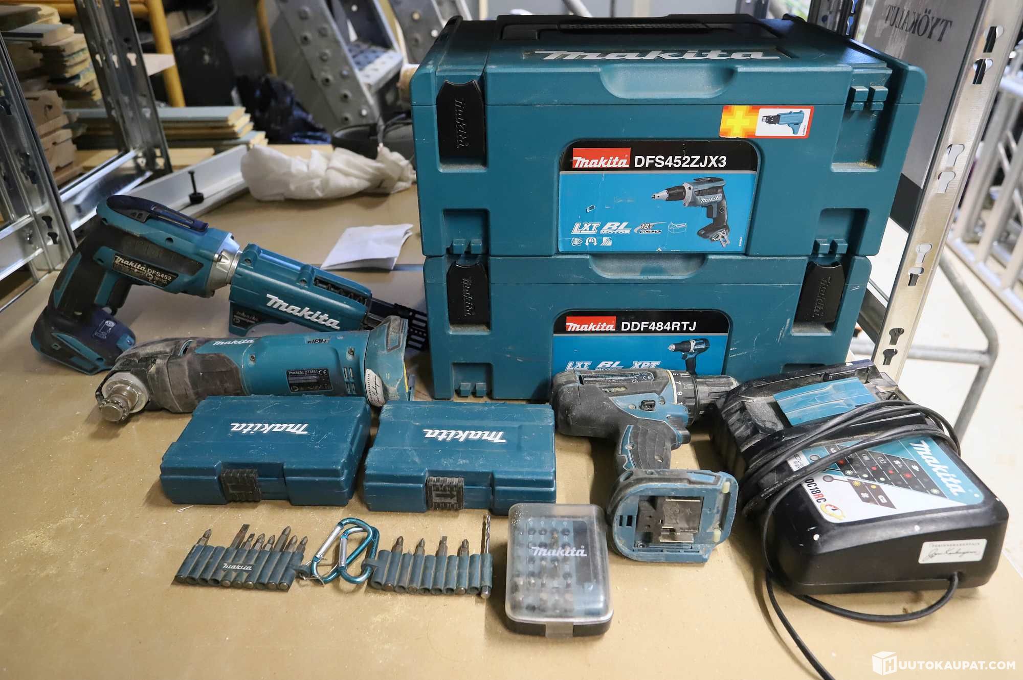 Makita-akkuporakone, -monitoimikone ja ruuvinväännin lisäosilla.