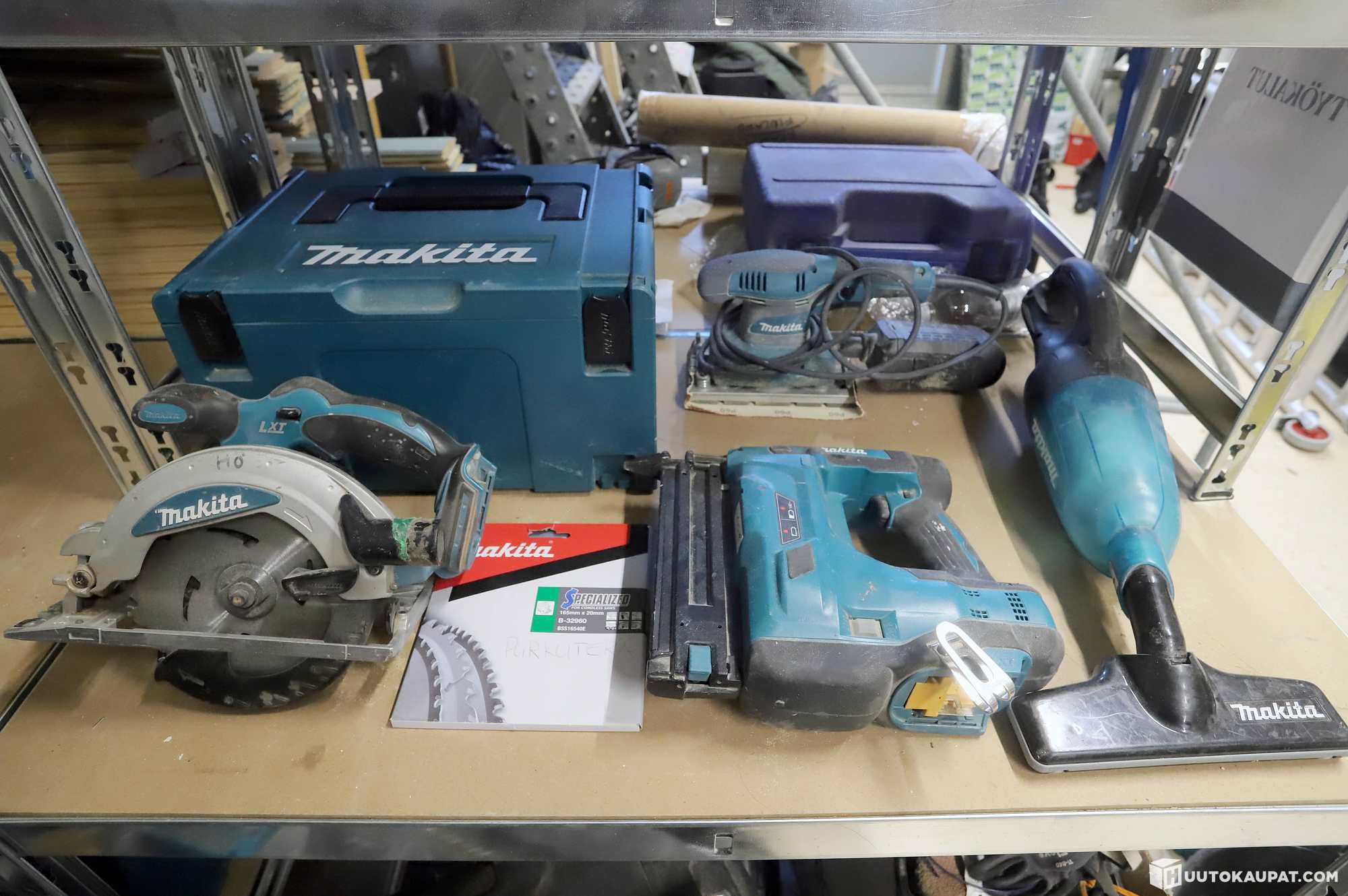 Makita-akkupyörösaha, -naulain, -tasohiomakone ja -imuri.