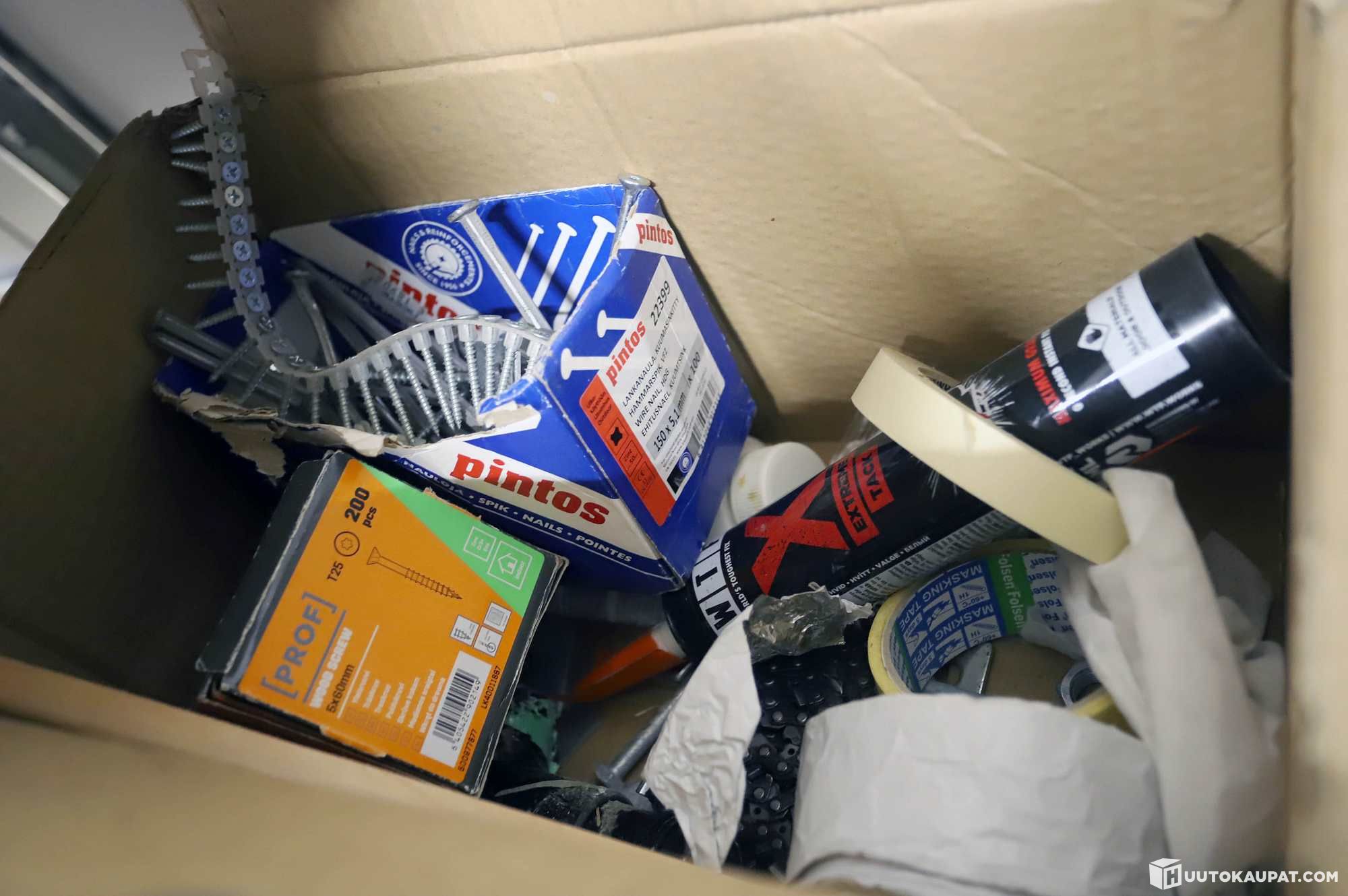 Kaikki "Työmaiden tarvikkeet"-hyllyssä olevat tavarat (paitsi ylähyllyn laudat) ja hyllyn edessä olevat ämpärit, vaaterekki, talikko kuuluvat huutoon.