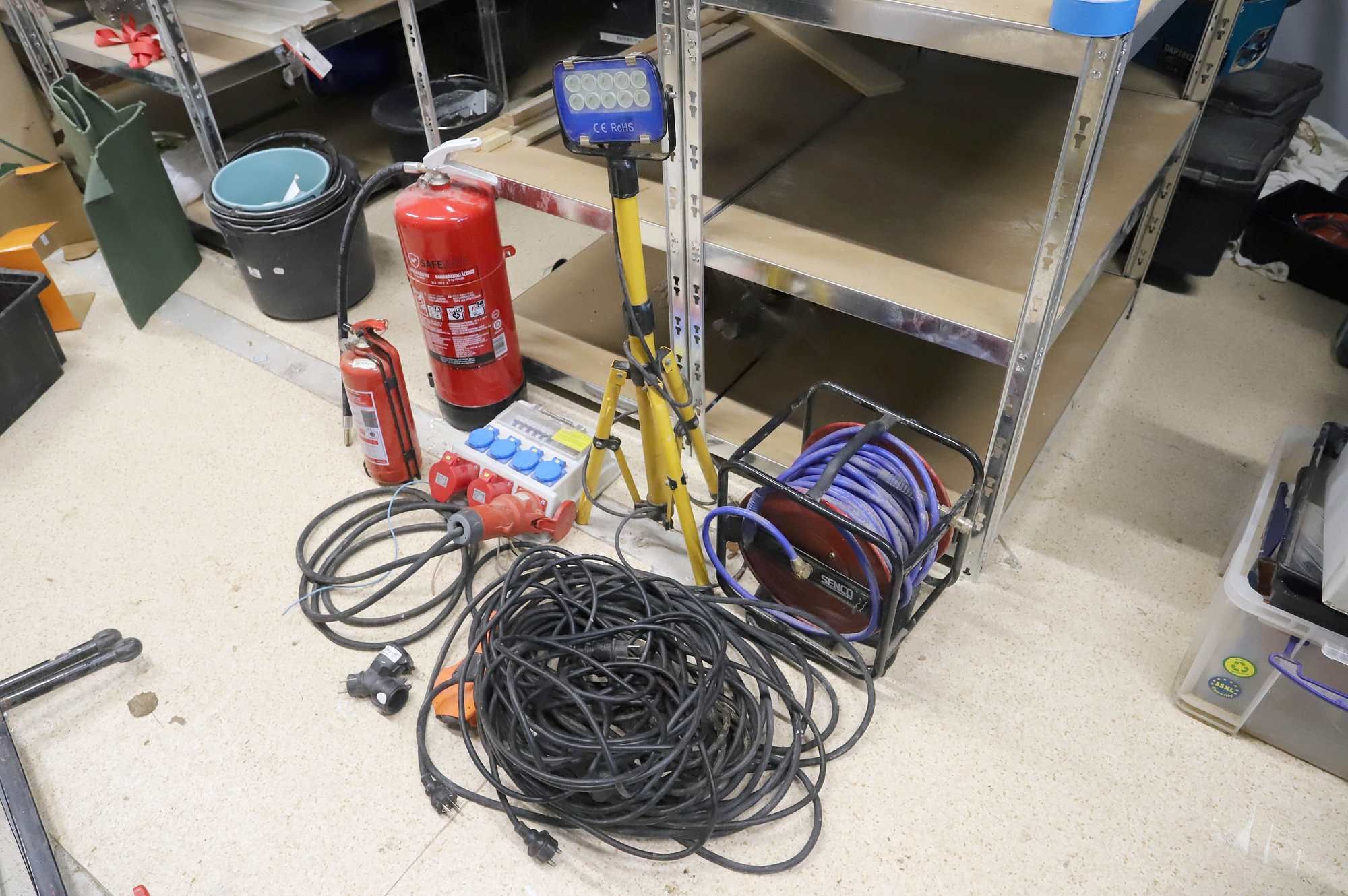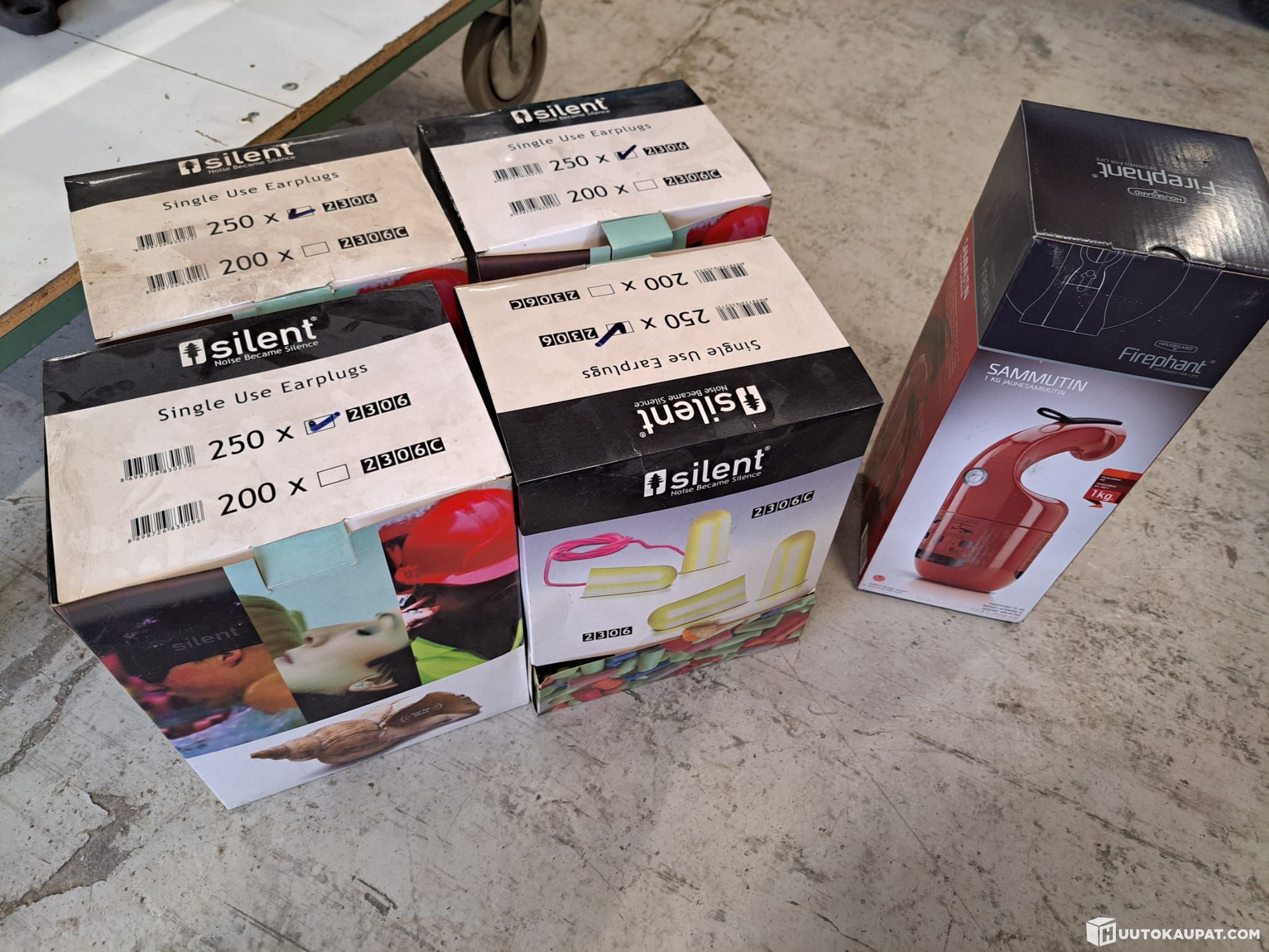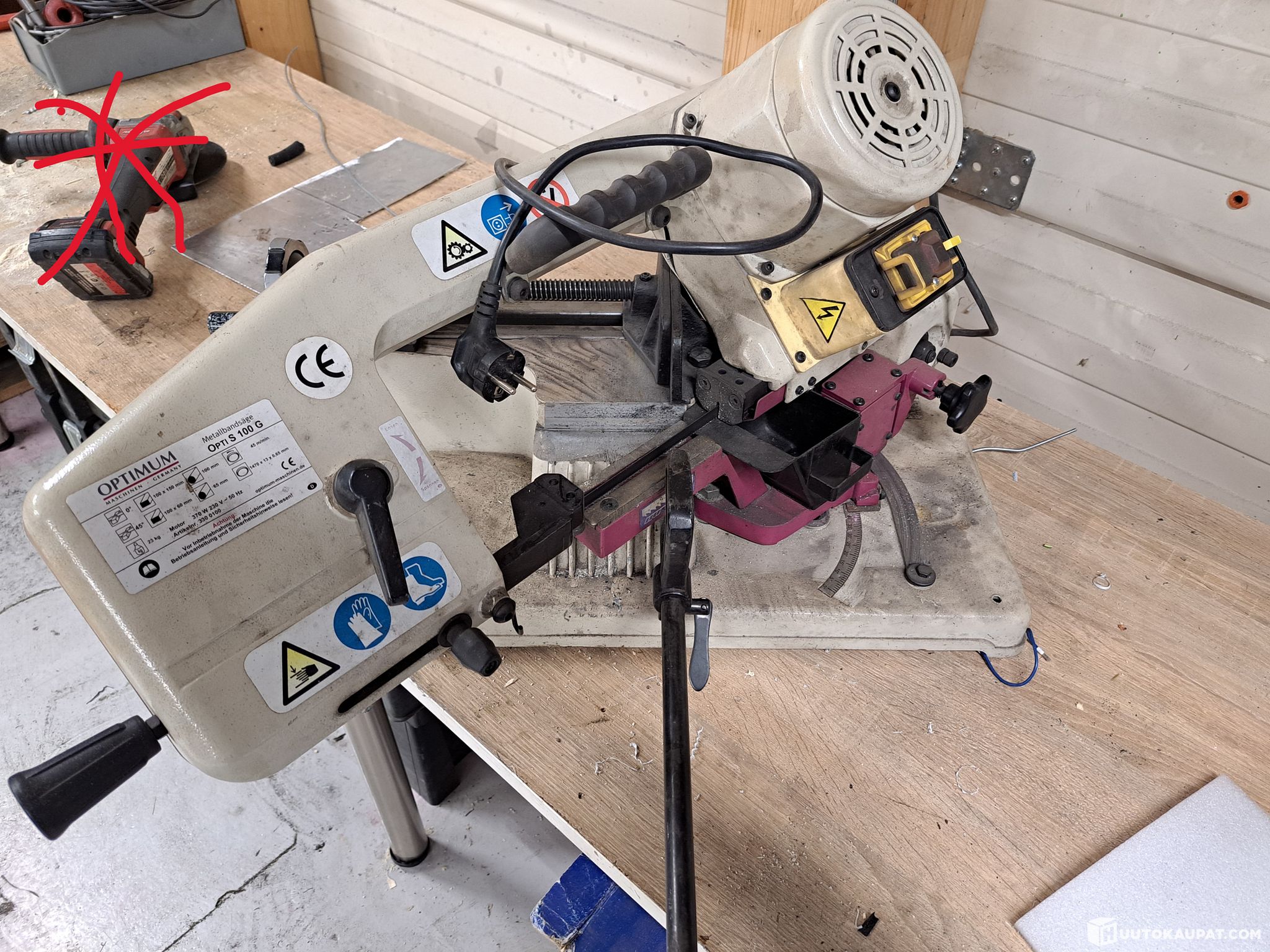 Automaatiofirman käytöstä poistuneet metallivannesaha, penkkihiomakone, kulmahiomakone ja katkaisuteline, jiirisaha, ruuvipenkki, hiekkapuhalluspönttö, reikäsahasarja (ei täydellinen) sekä sekalainen lajitelma kiinnitystarvikkeita. 4 laatikollista korvatulppia ja firephant-käsisammutin.