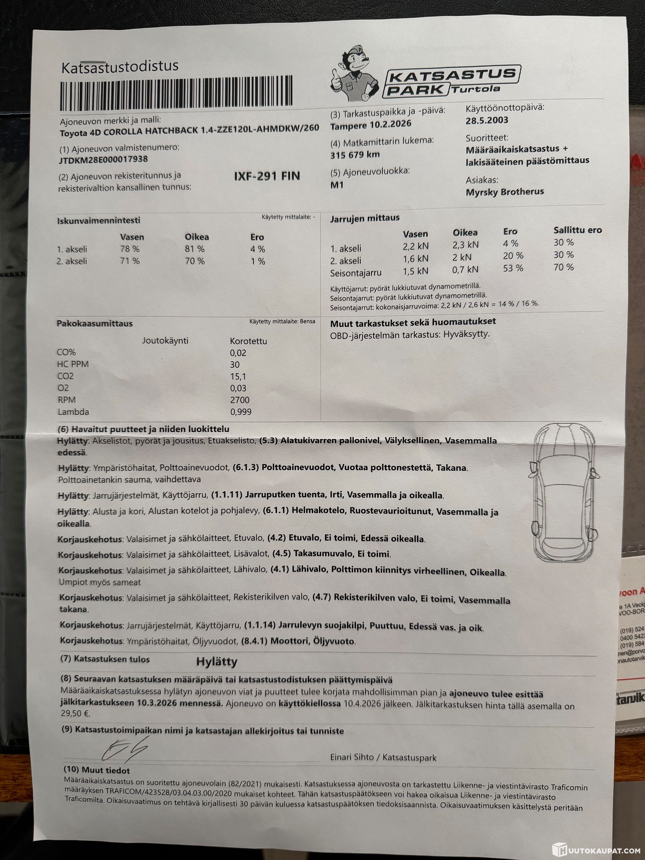 10.2.2026 Määräaikaiskatsastus hylätty. Jälkitarkastus 10.3. mennessä. Katsastuksen ajoaika 10.4.2026 loppuun. Katso viimeinen kuva katsastuksesta.