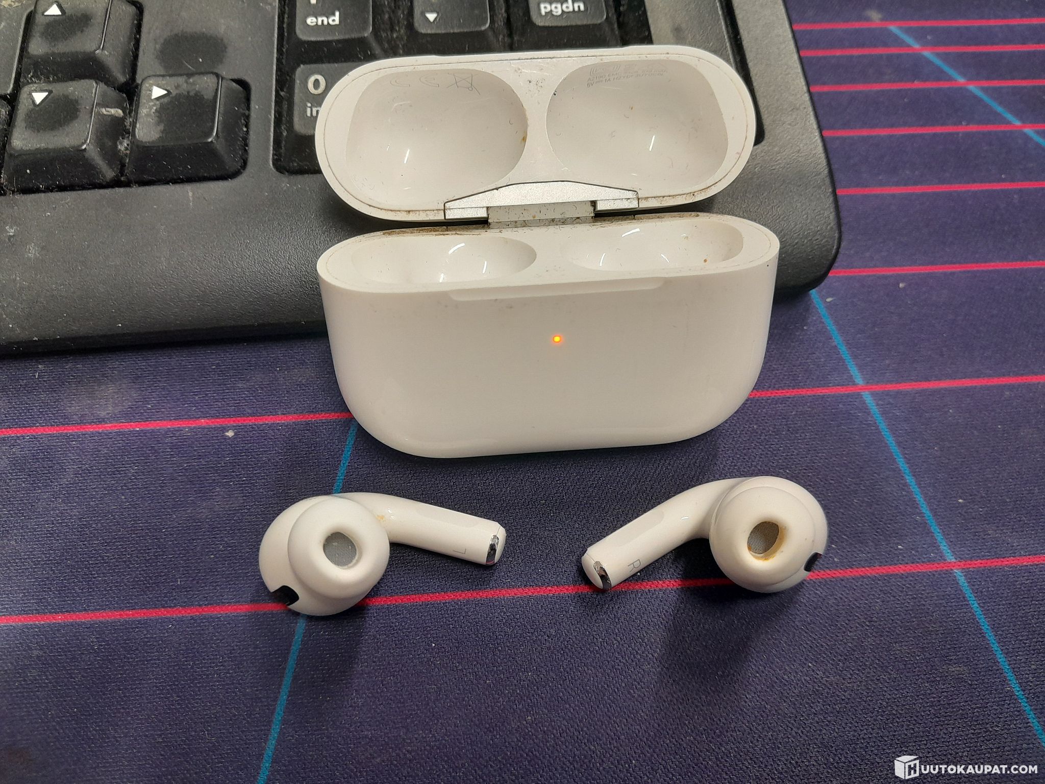 Käytetyt. Mukana napit, latauskotelo ja laturi. Korvapehmusteet kokoa M