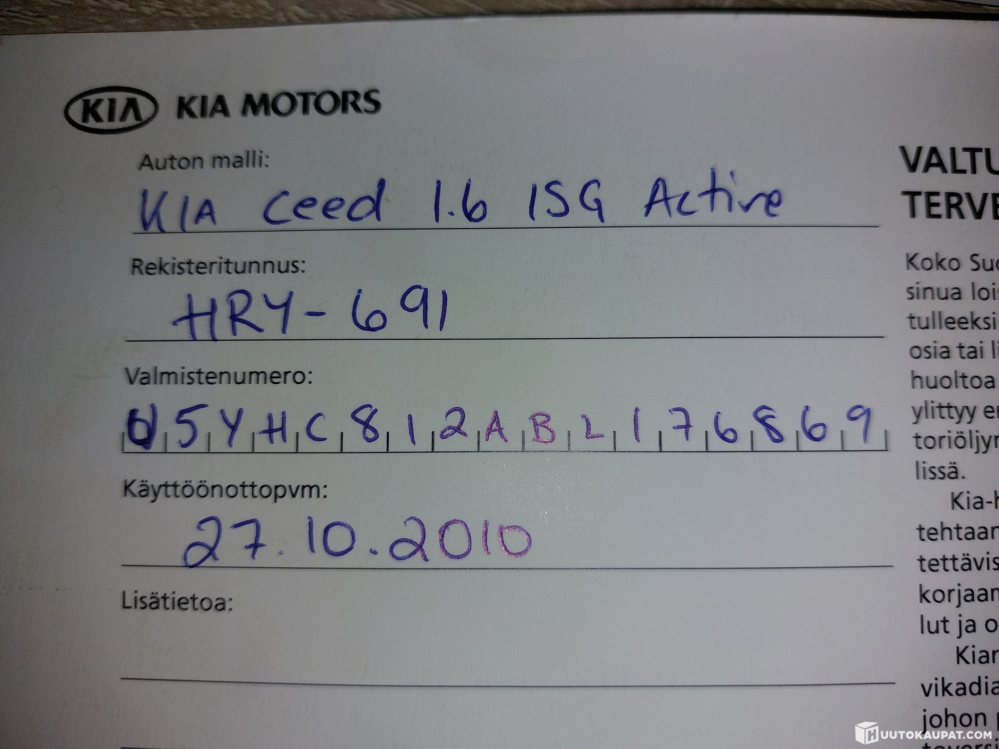 Ajoneuvo noudettava 7vrk kuluessa huutokaupan päättymisestä ellei toisin sovita -Huutokaupat.com.