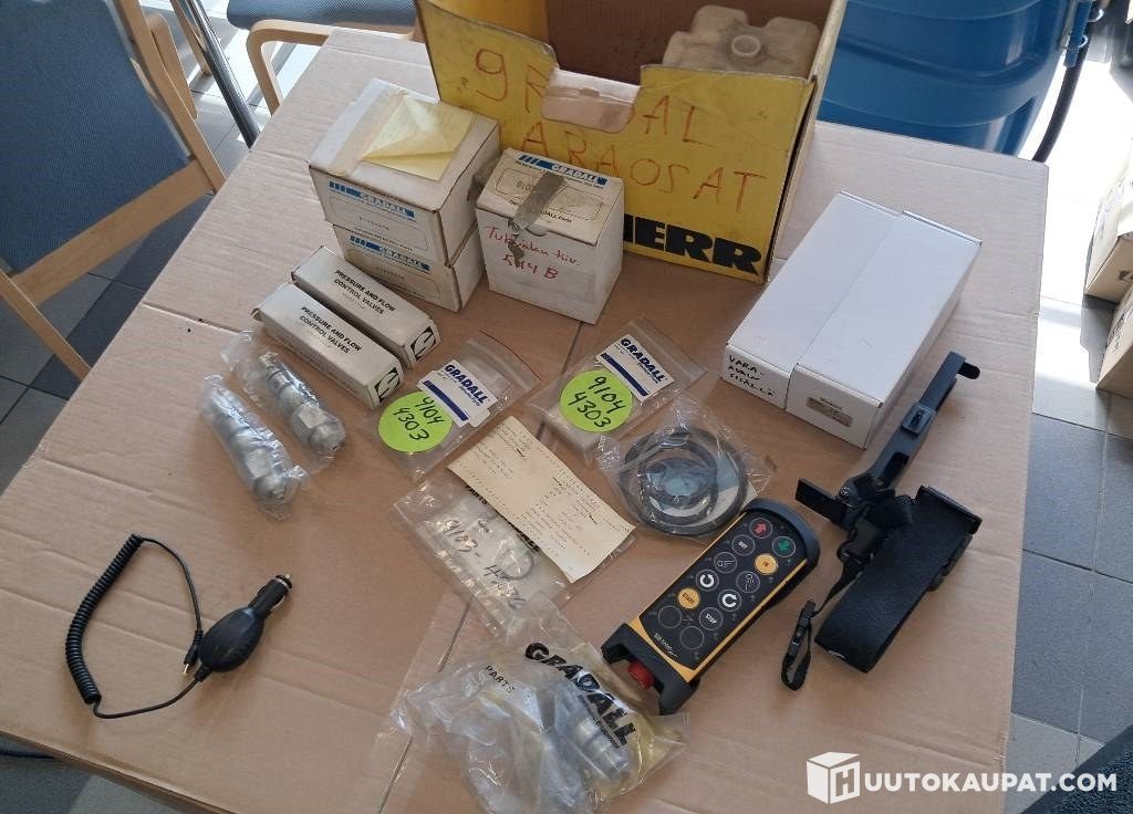 Käyttöohjeet, esite, varaosakuvasto ja jopa vara-avain tallella. Mukaan tulee lisäksi laatikollinen varaosia (tiivisteitä, venttiilikaroja) ja trukkipiikkien, kauhan (huono), henkilökorin lisäksi varapyörä ja sovite haarukkakelkkaan