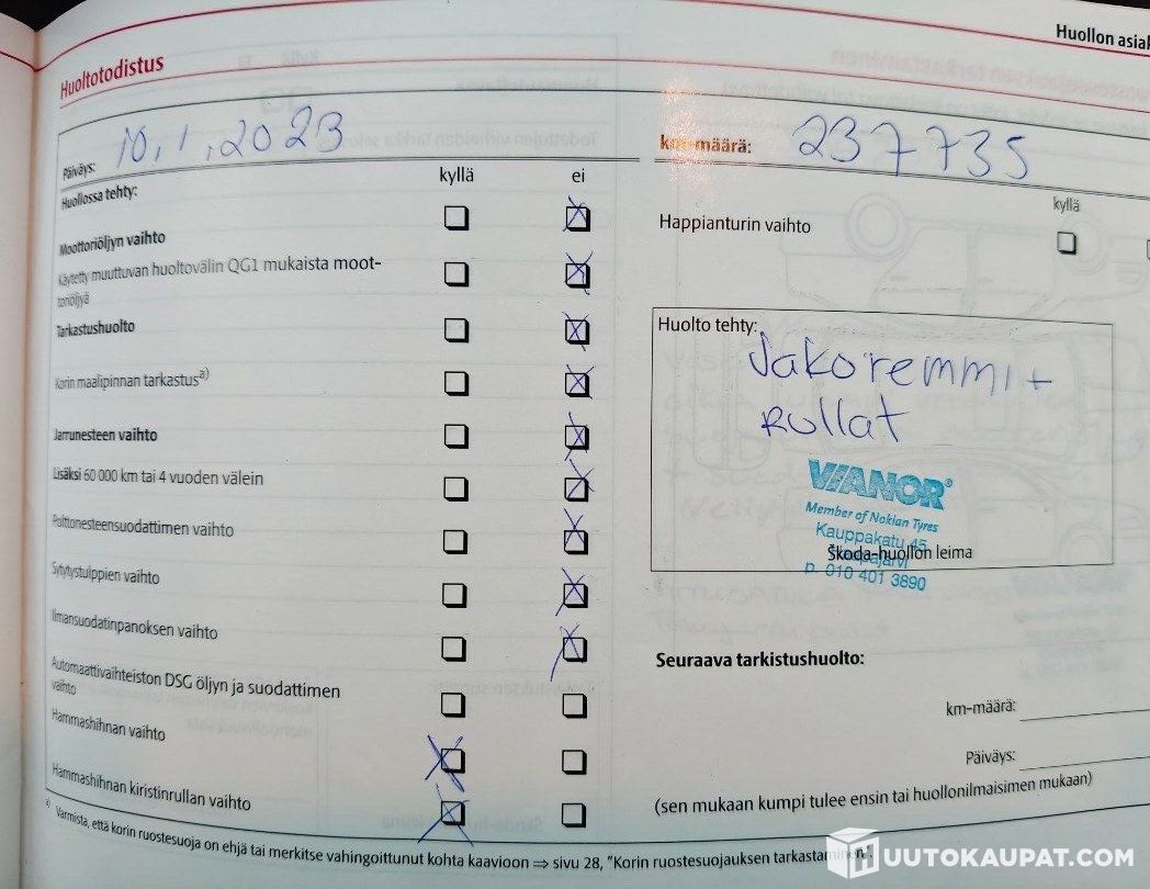 Öljyt ja suodattimet vaihdettu juuri, ja jakopääremontti tehty 237 735 km kohdalla vuonna 2023.