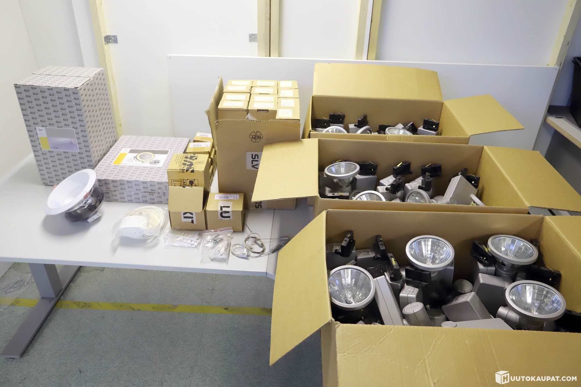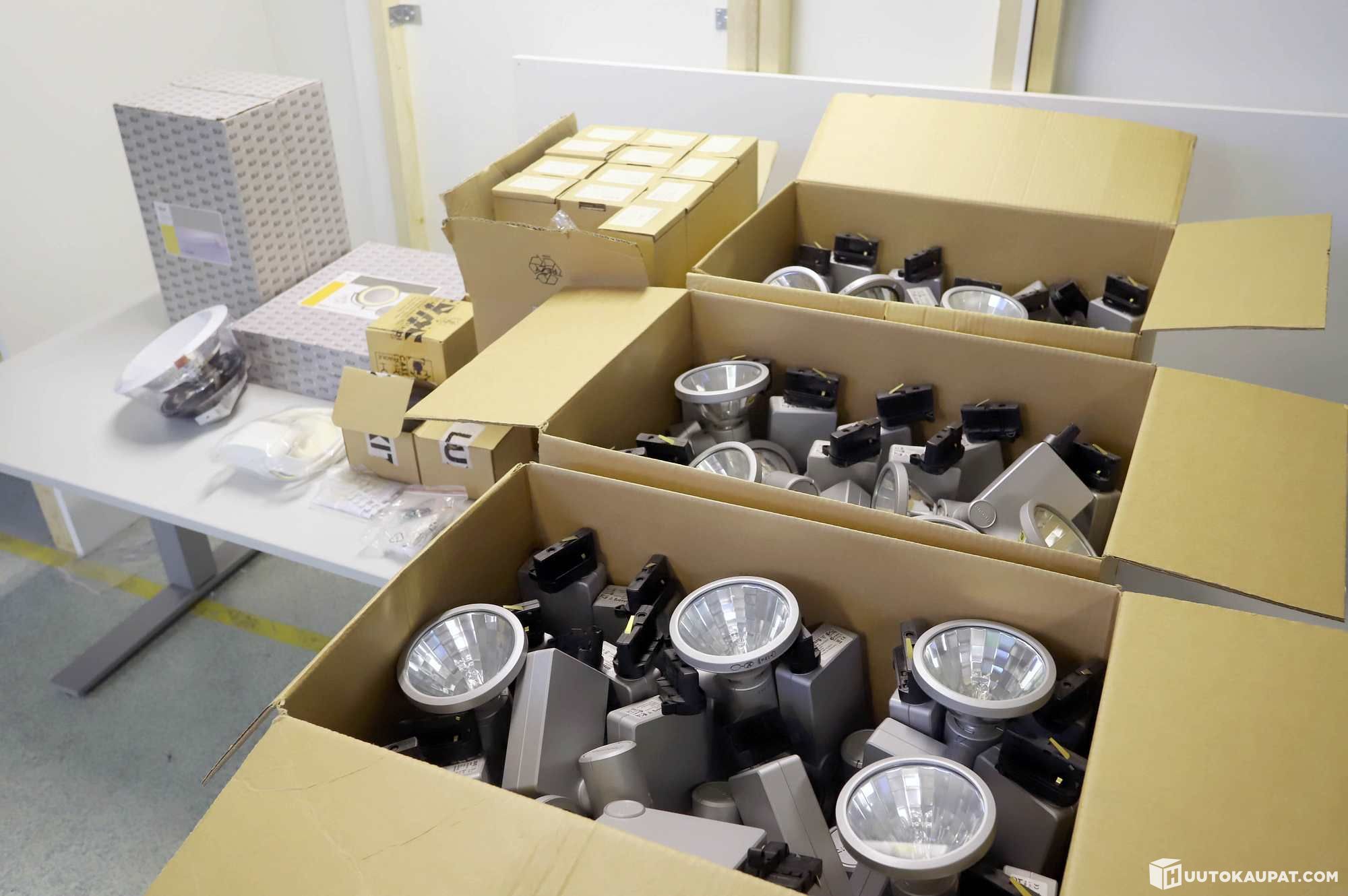 Erä valaisimia ja valaisimien varaosia.