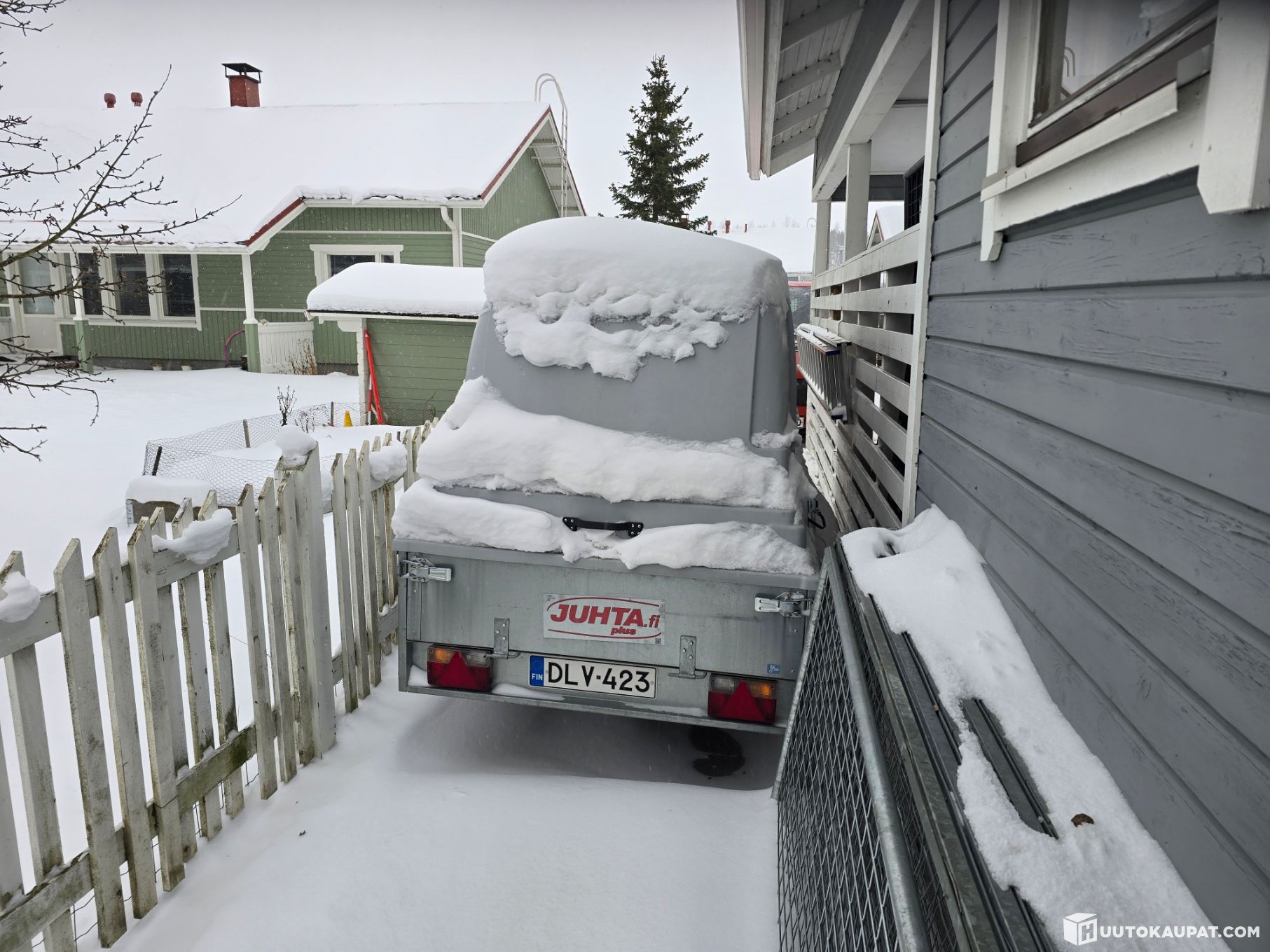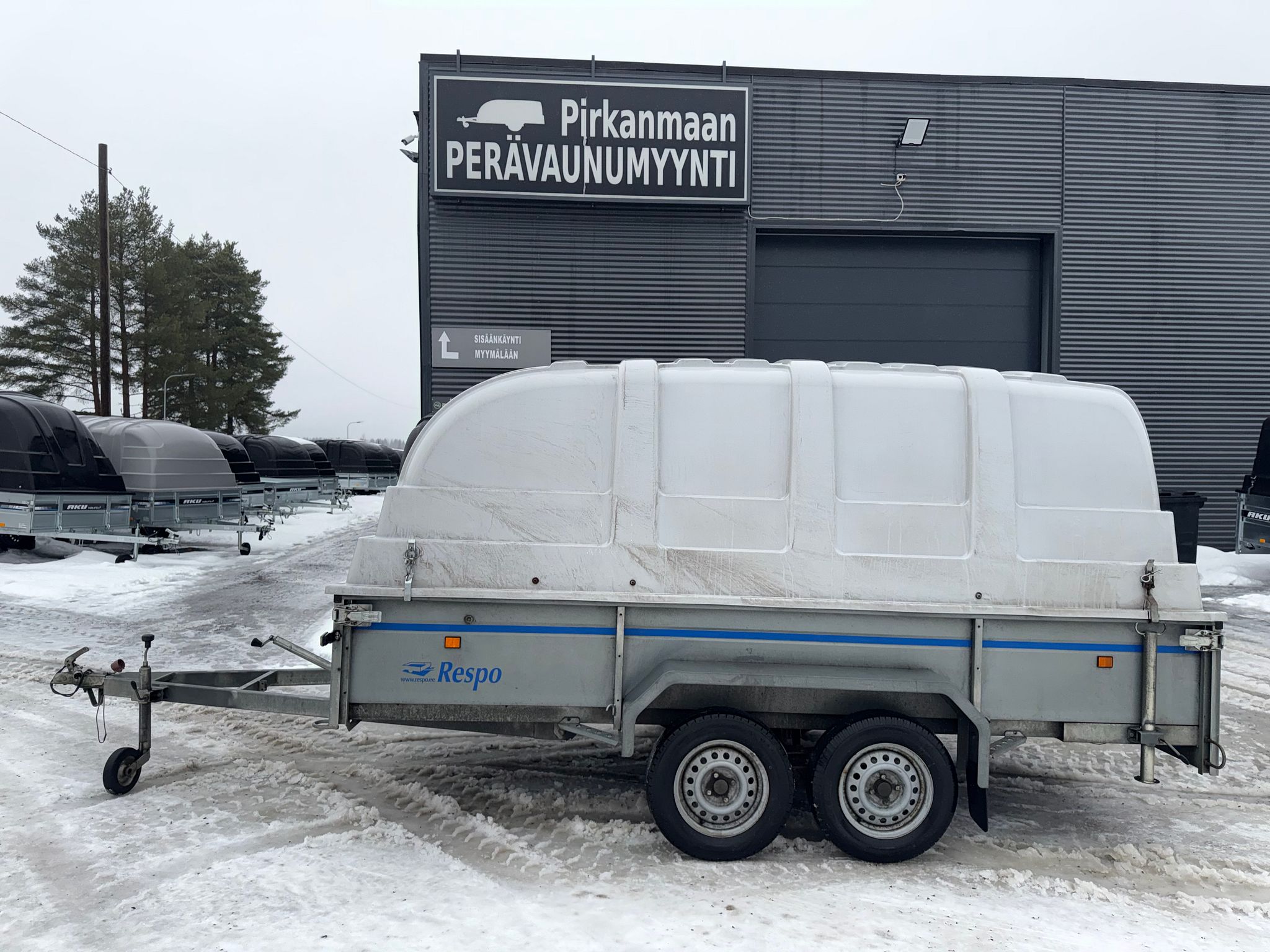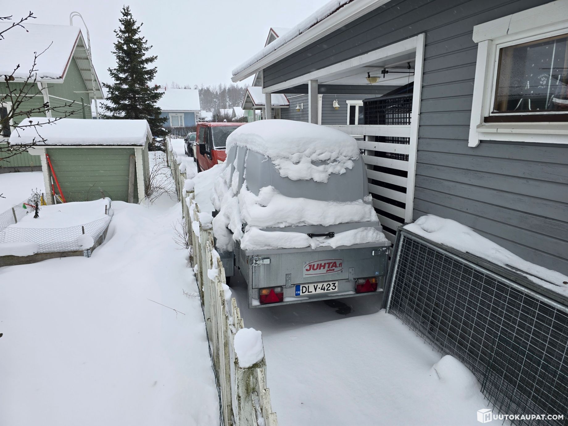 Siisti ja vähän käytetty kuomuperäkärry. Peräkärry oli katselmointihetkellä täynnä tavaraa ja lumikinosten takana, mutta tyhjennetään ennen luovutusta. Katso Traficom -liite.